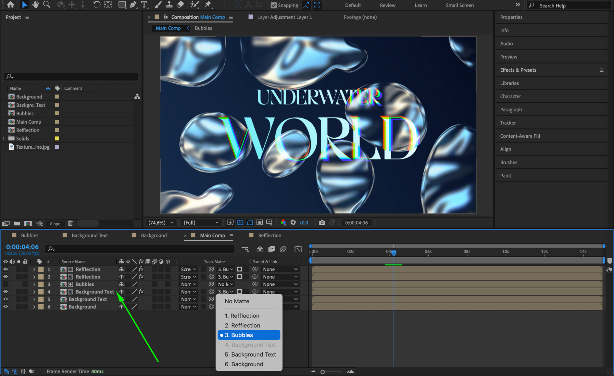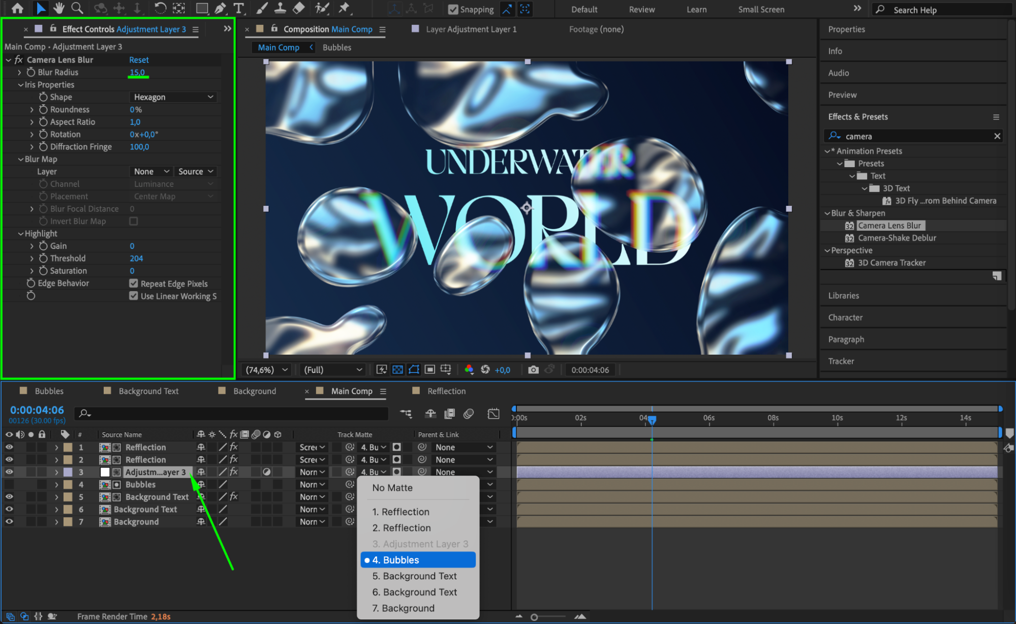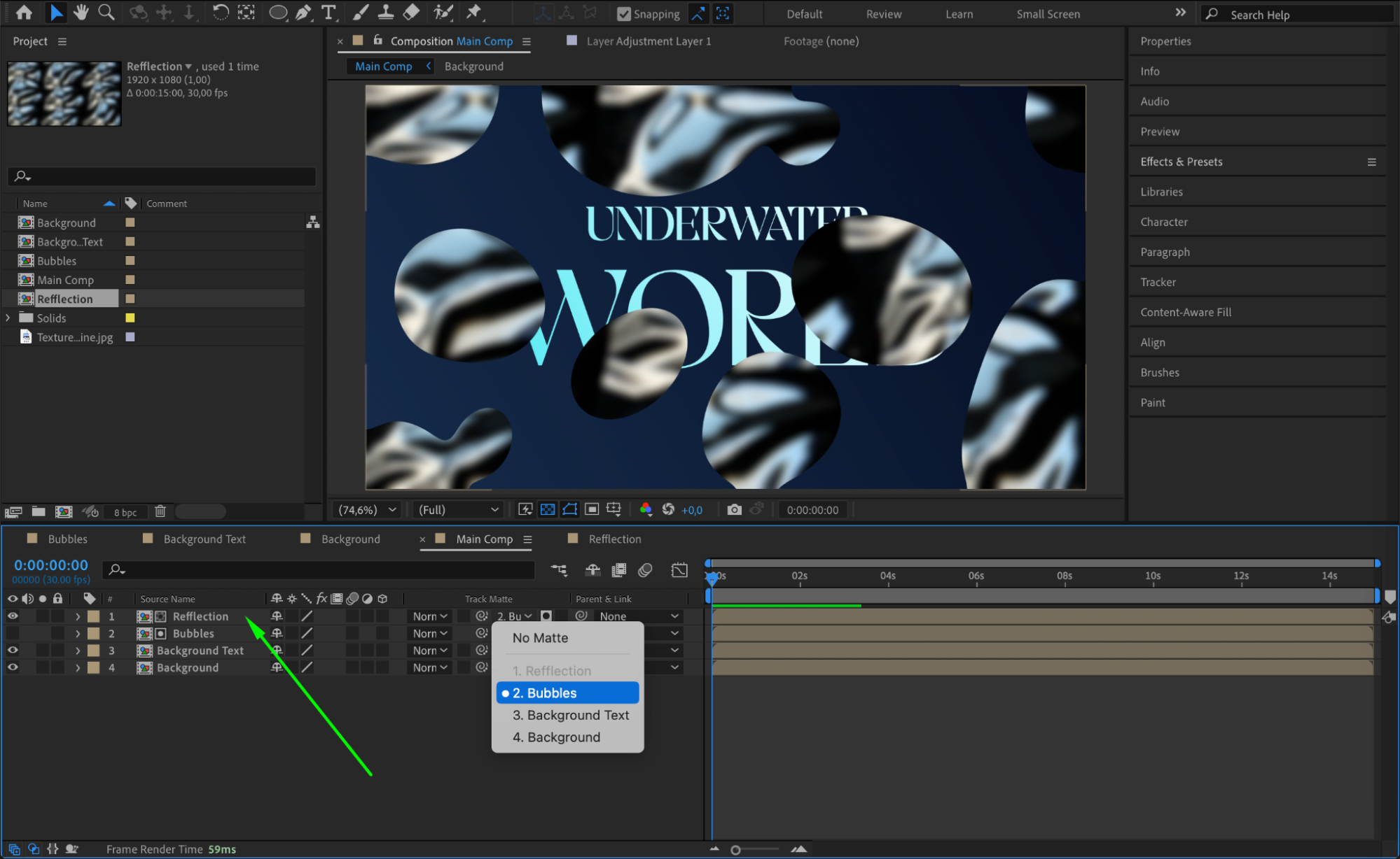 In the Track Matte Column, choose Bubbles Comp for the adjustment layer.