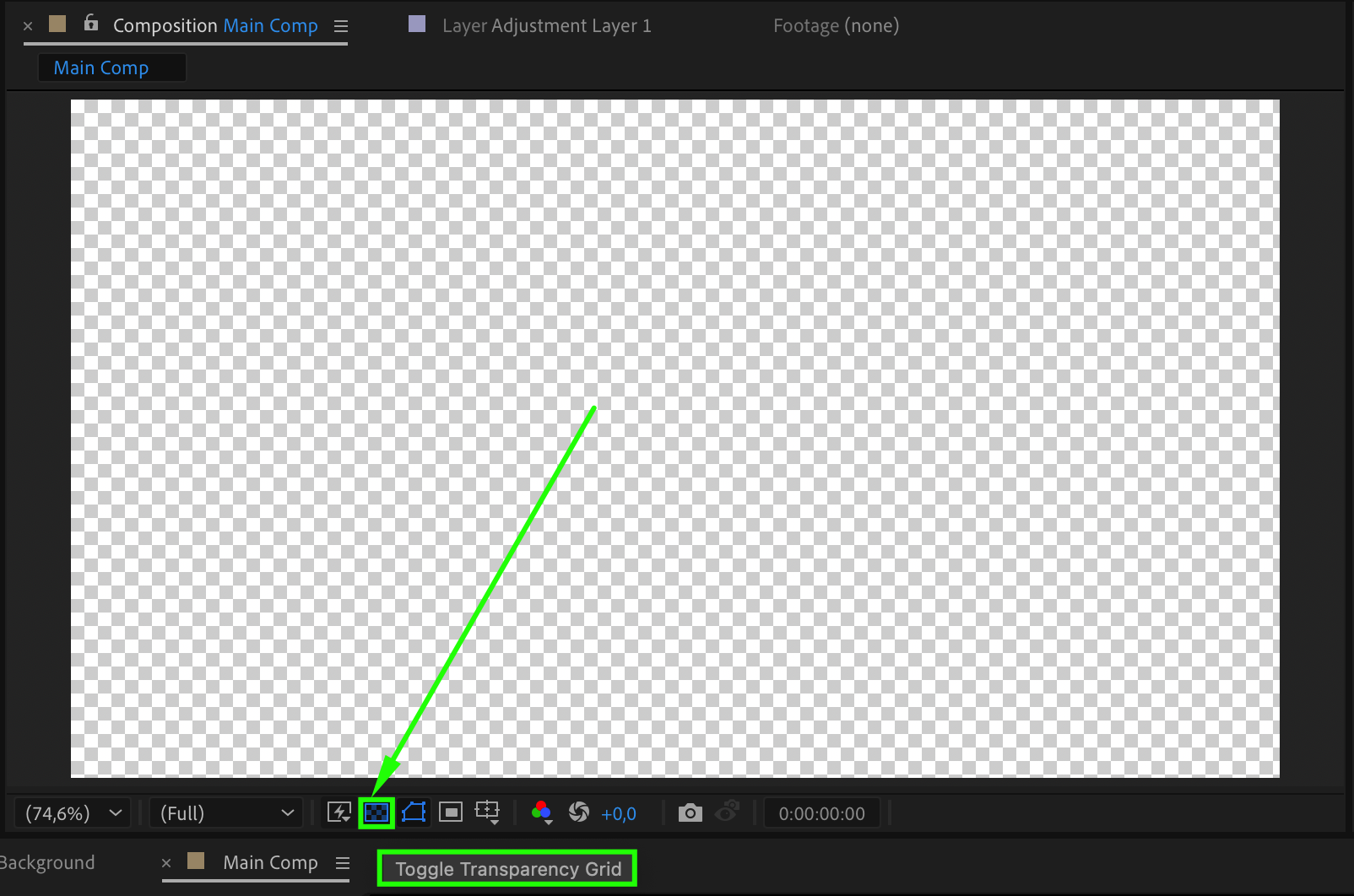 Go to Composition > New Composition, name it “Main Comp”, and click the Toggle Transparency Grid button.