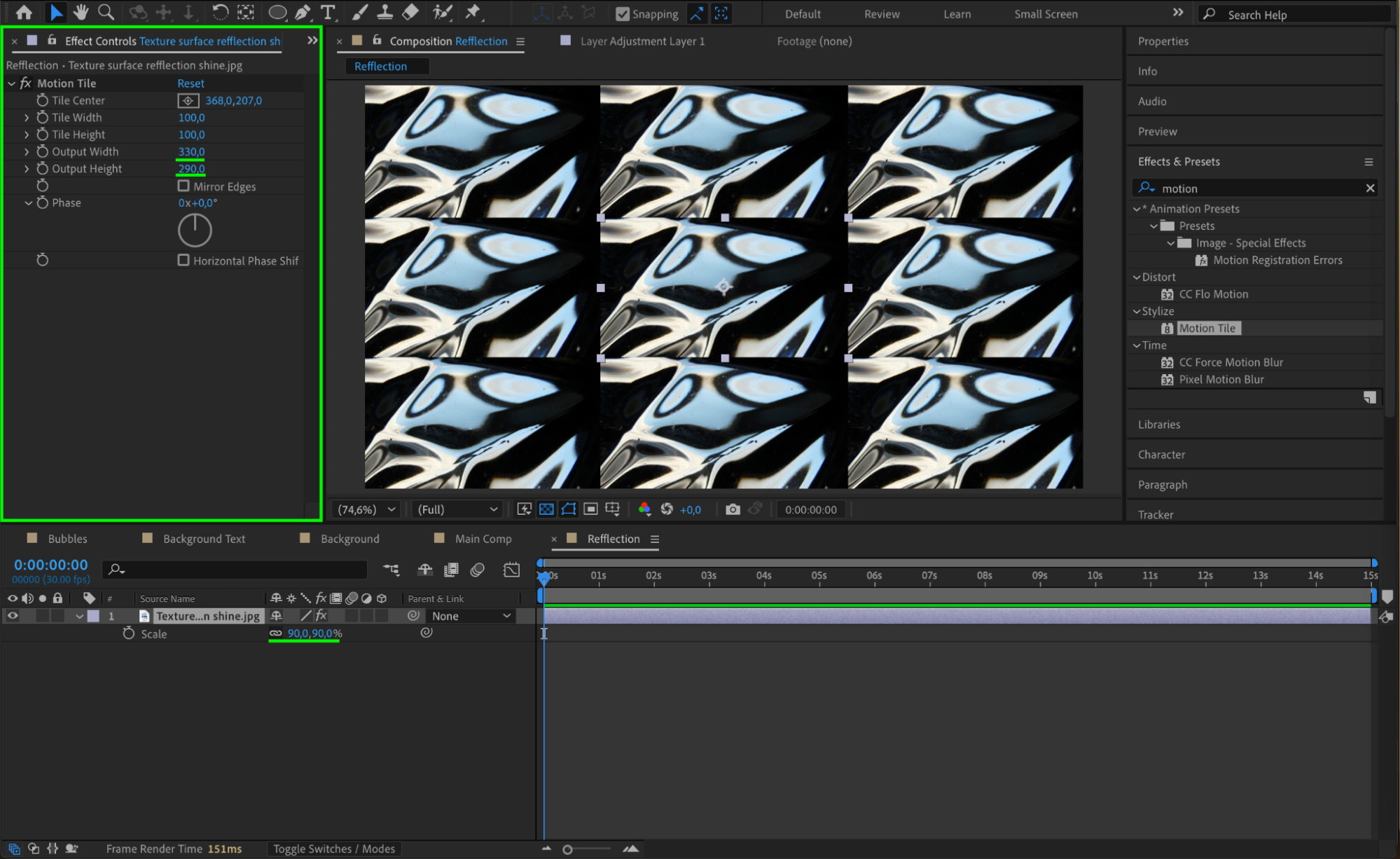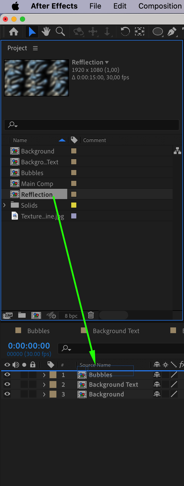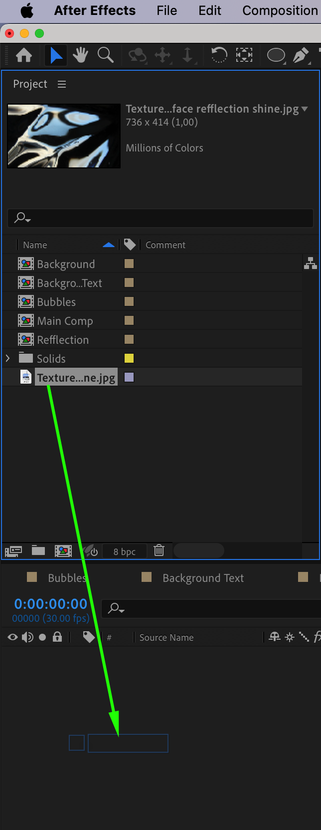 Go to Composition > New Composition, name it “Reflection”, and import a surface texture image to simulate reflection.