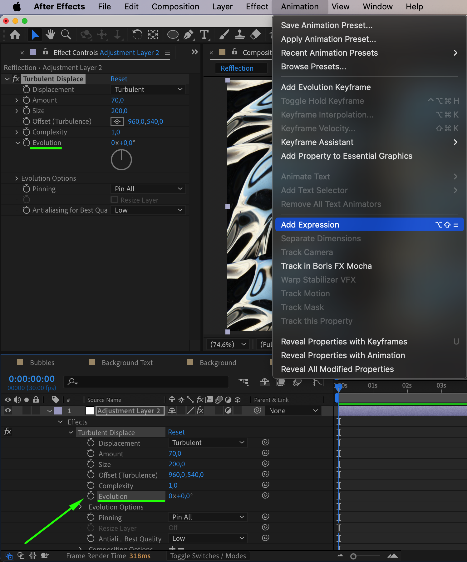 To animate the distortion, go to Animation > Add Expression under Evolution and enter: