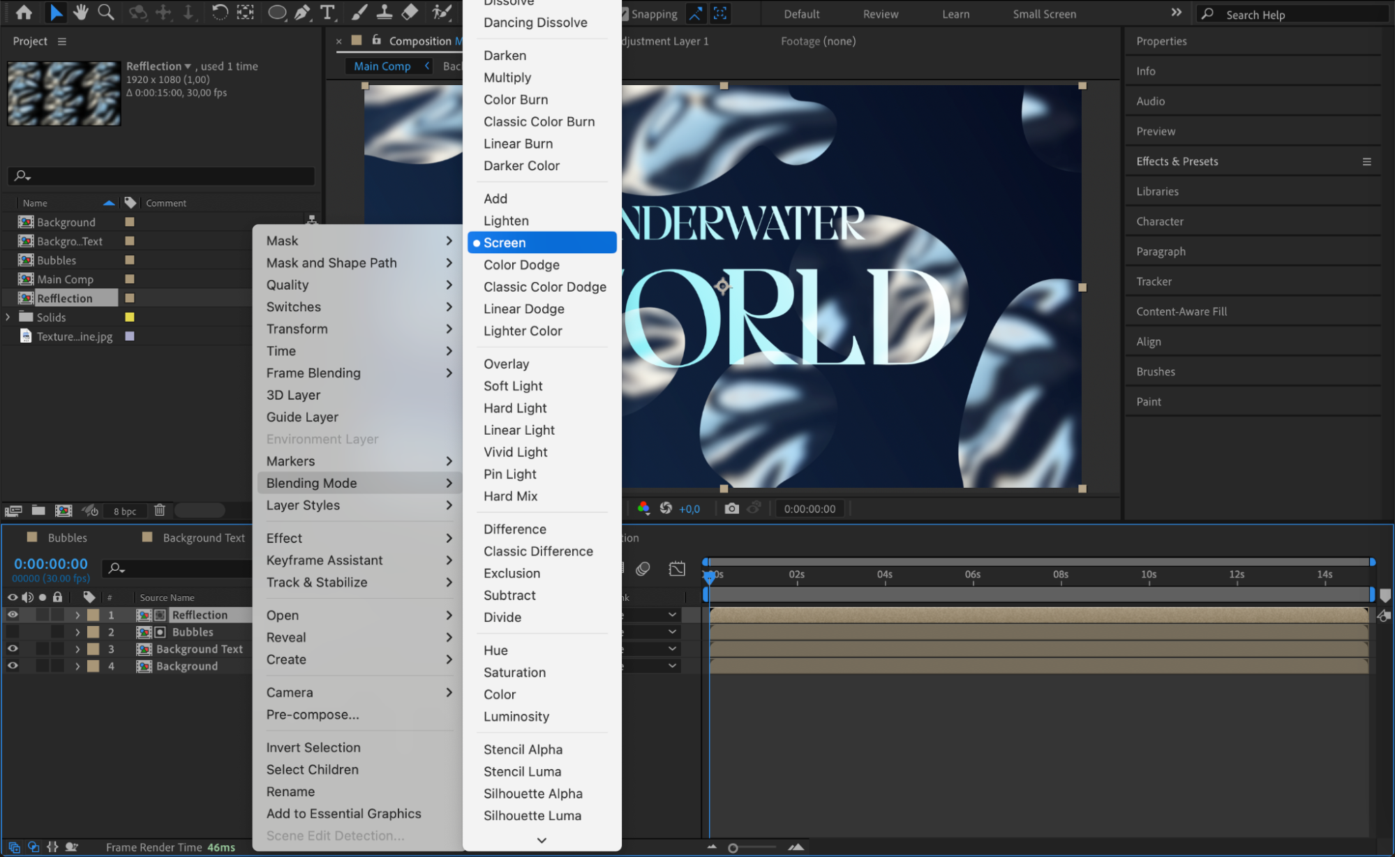 In the Track Matte column, select Bubbles Comp, and set the Blending Mode to Screen.