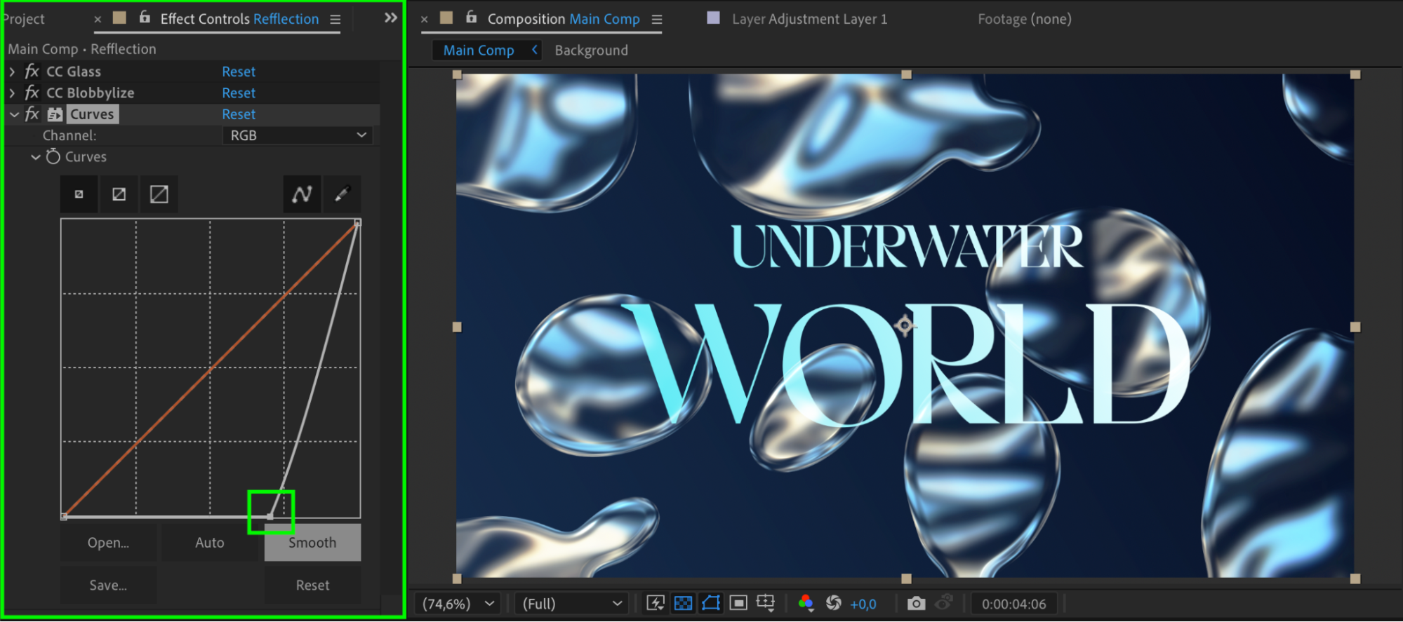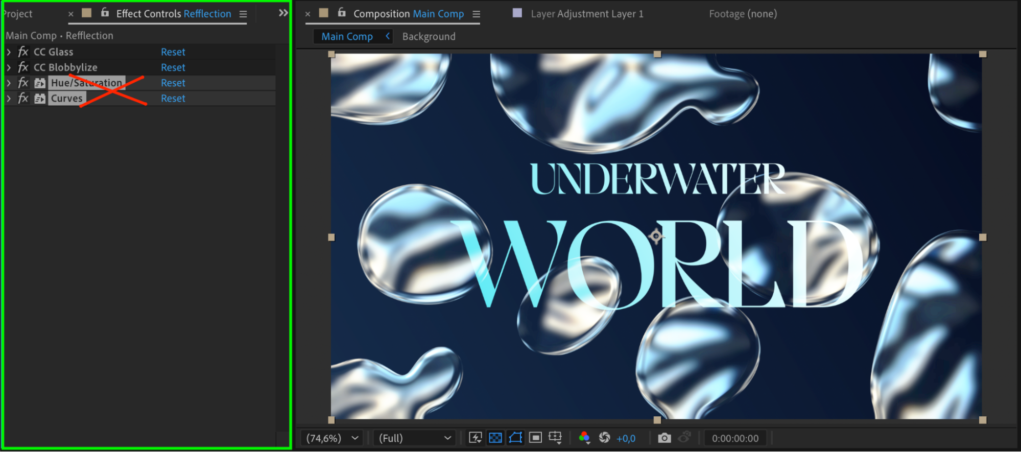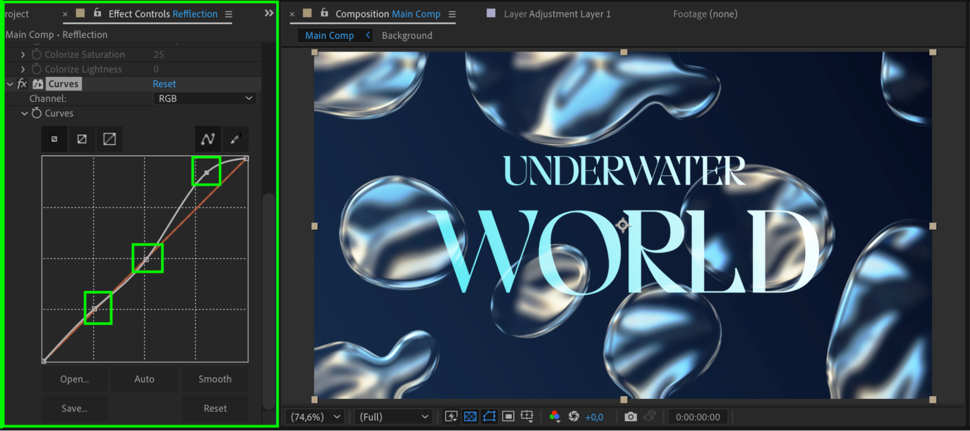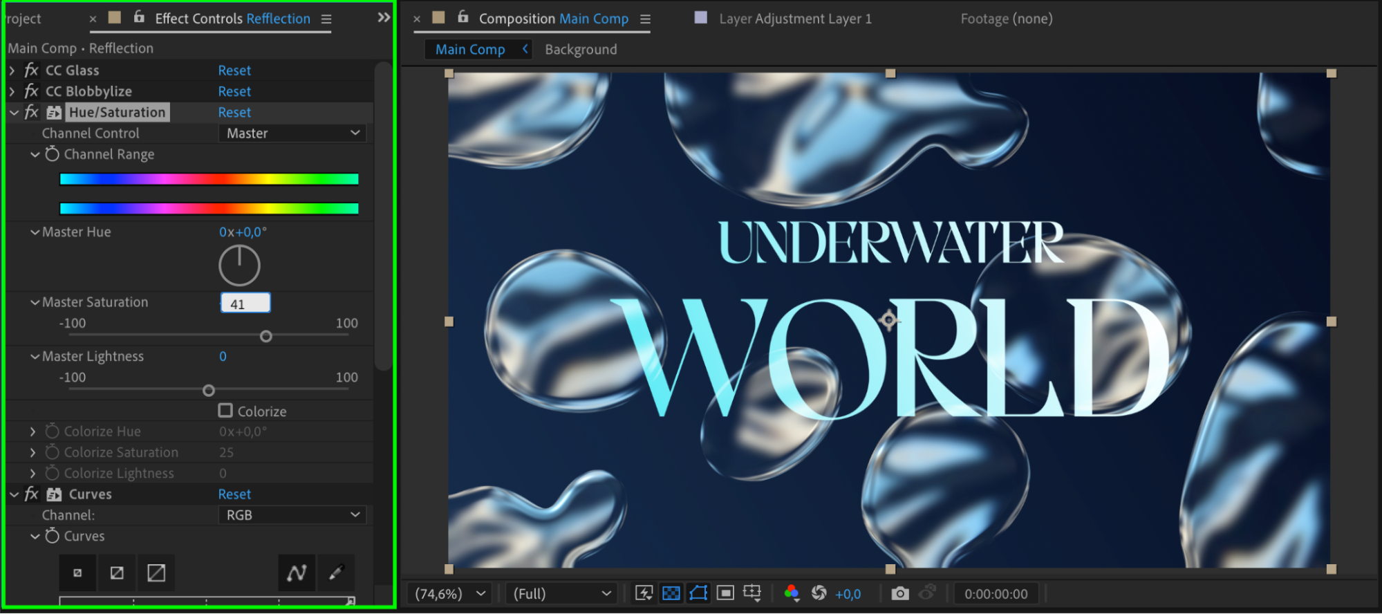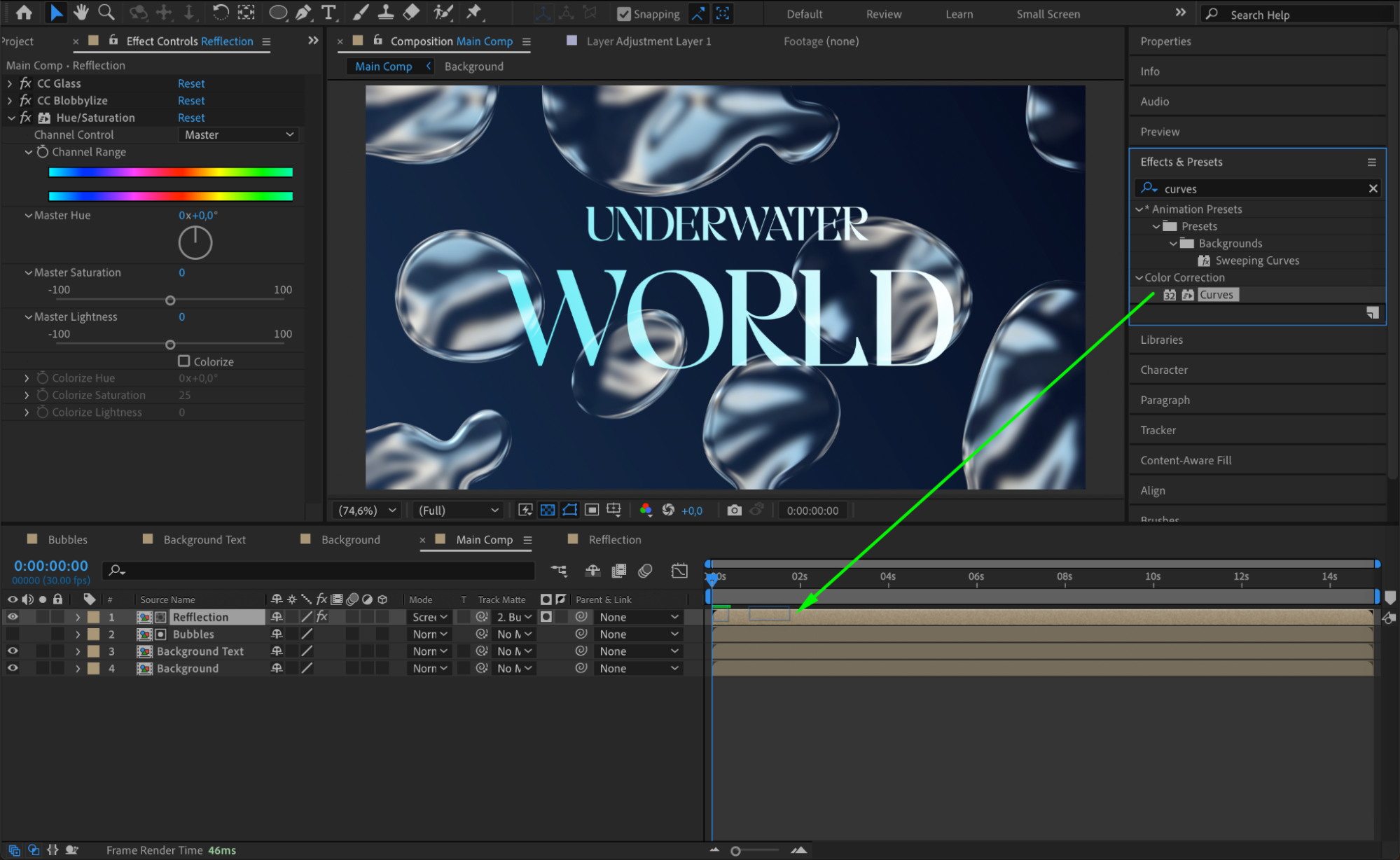 Apply Hue/Saturation and Curves effects to the Reflection Comp.