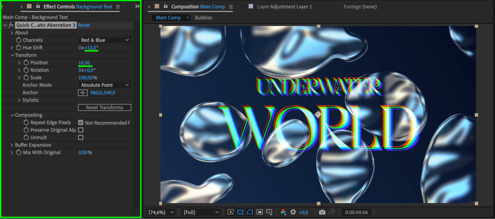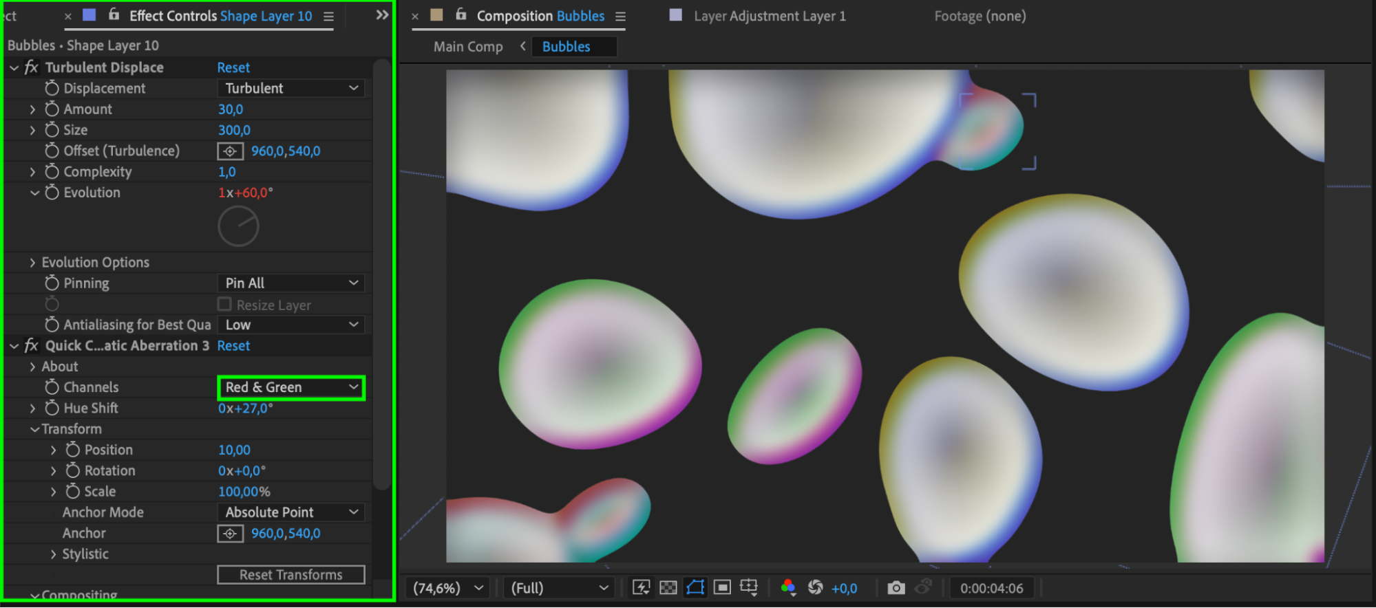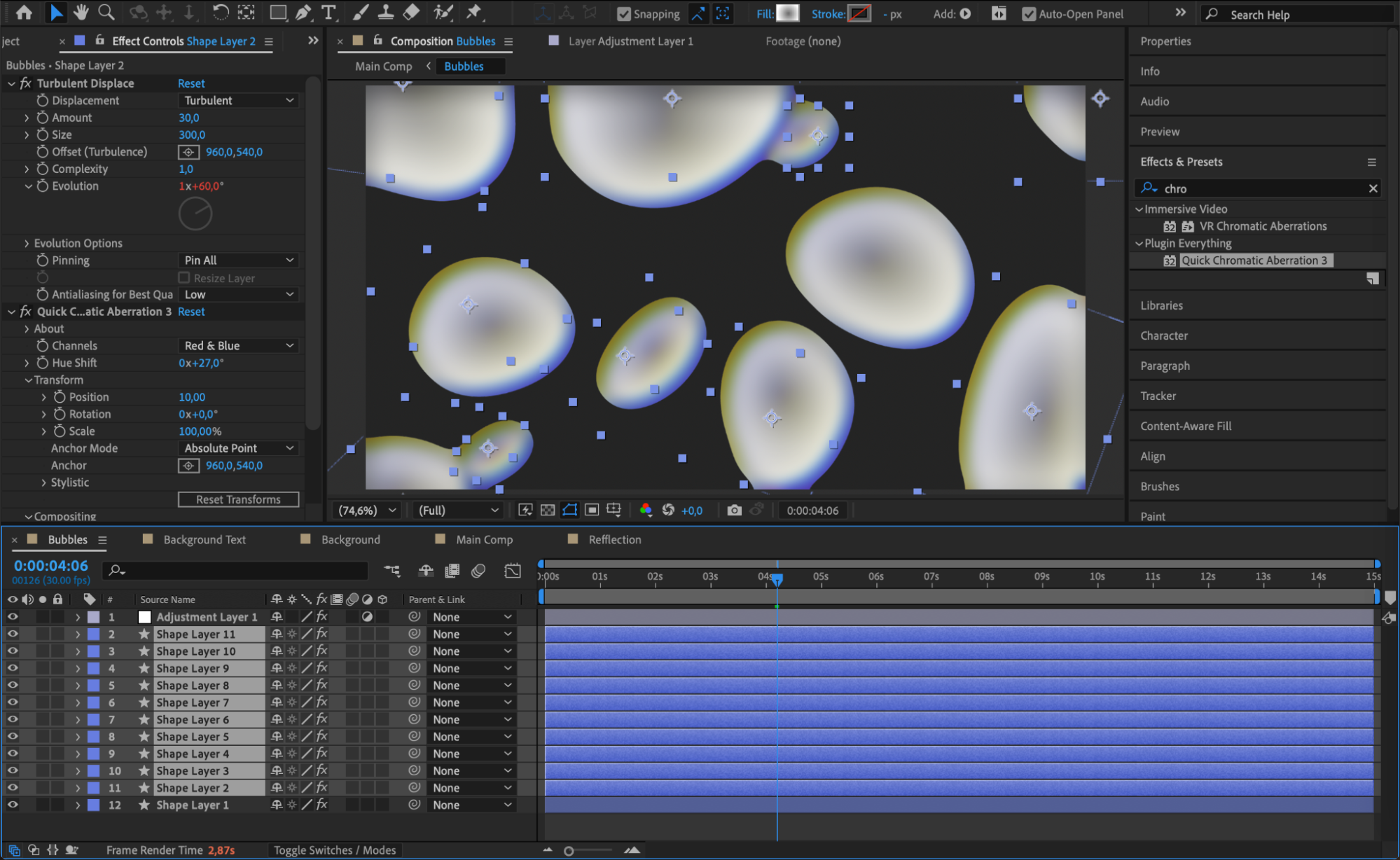 Apply the Quick Chromatic Aberration 3 (free plugin) to the Bubbles Comp.