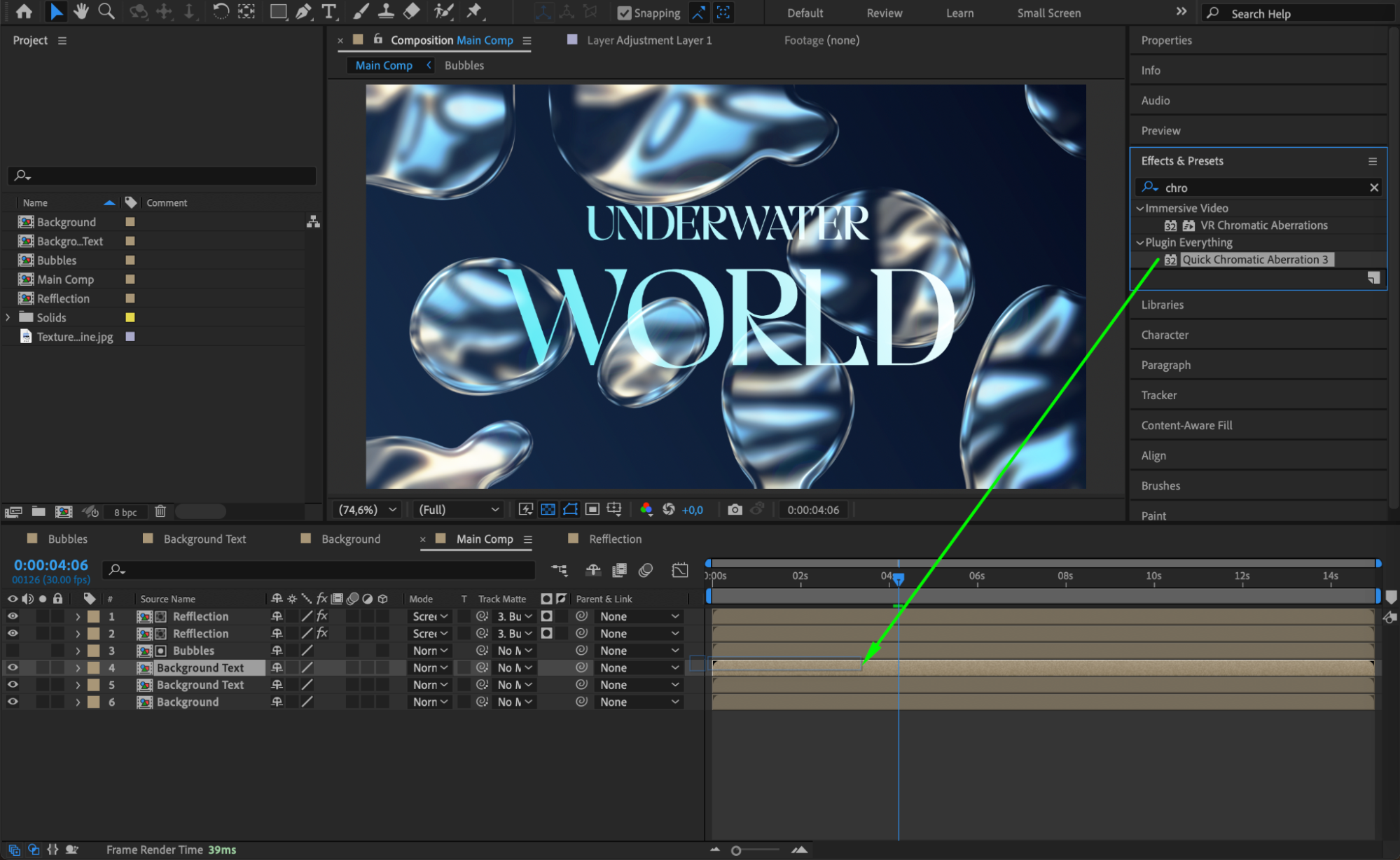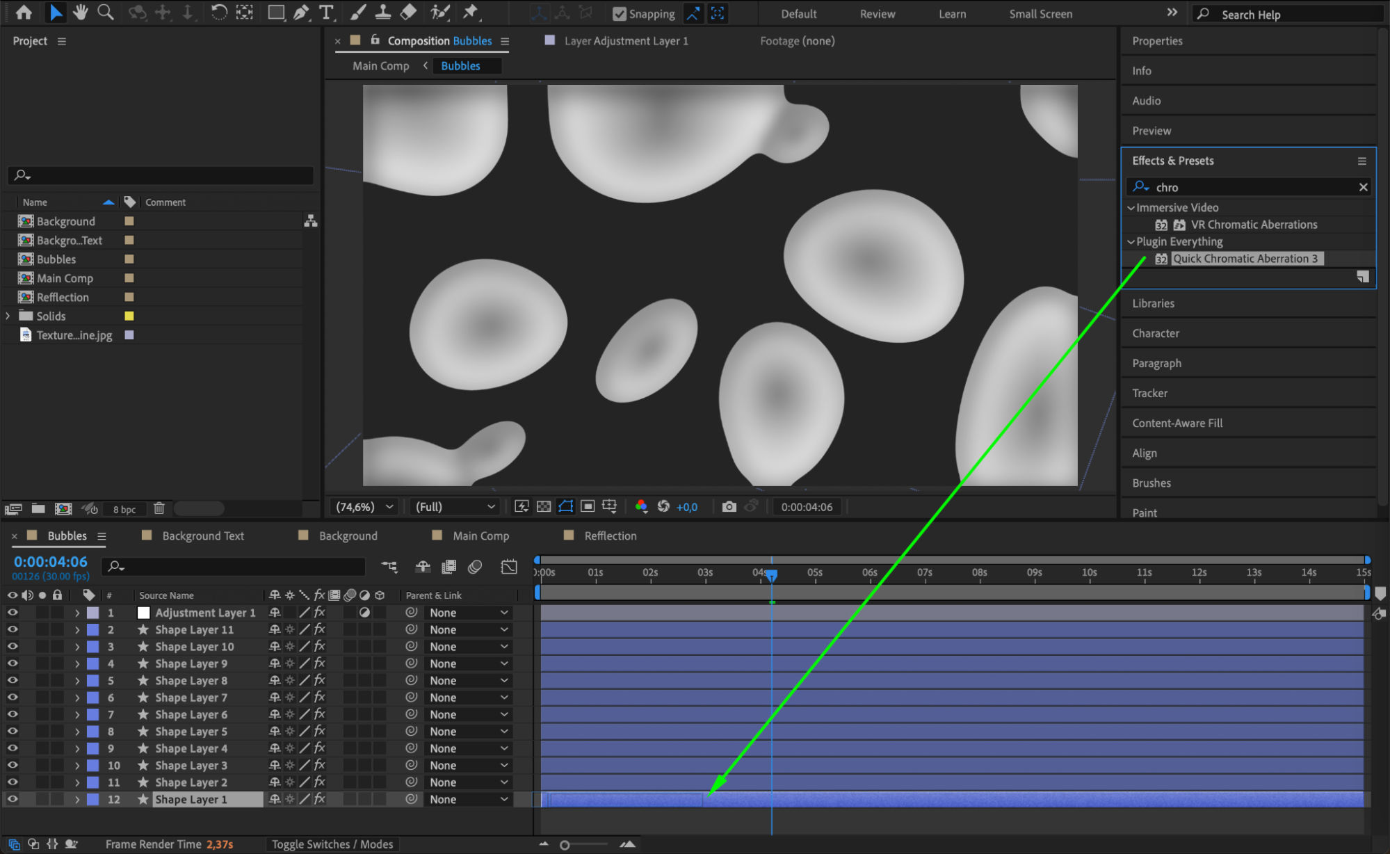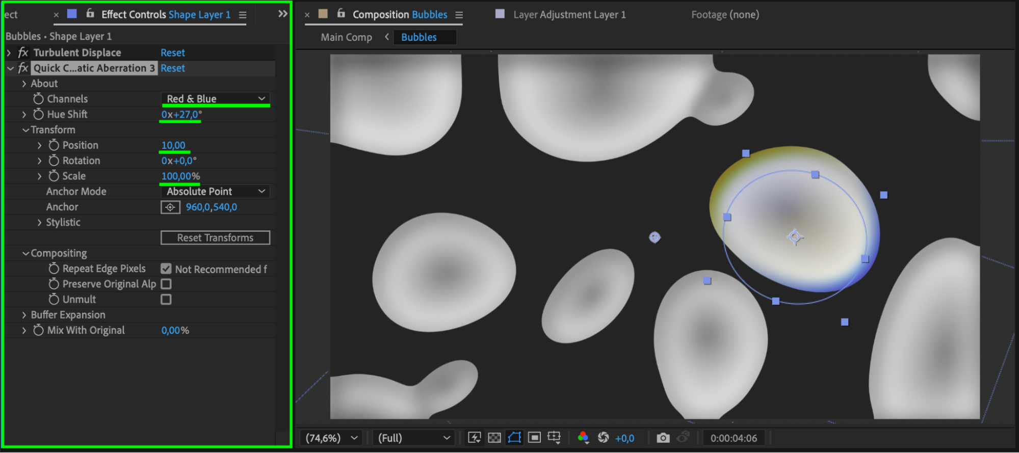 Apply the Quick Chromatic Aberration 3 (free plugin) to the Bubbles Comp.