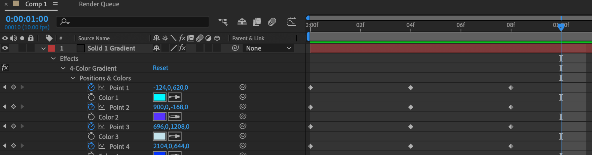 Click on the stopwatch next to points 1, 2, 3, and 4. Then, move the time indicator forward and reposition the four points beyond the composition boundaries. Repeat these actions as needed until the motion of your gradient satisfies your vision.