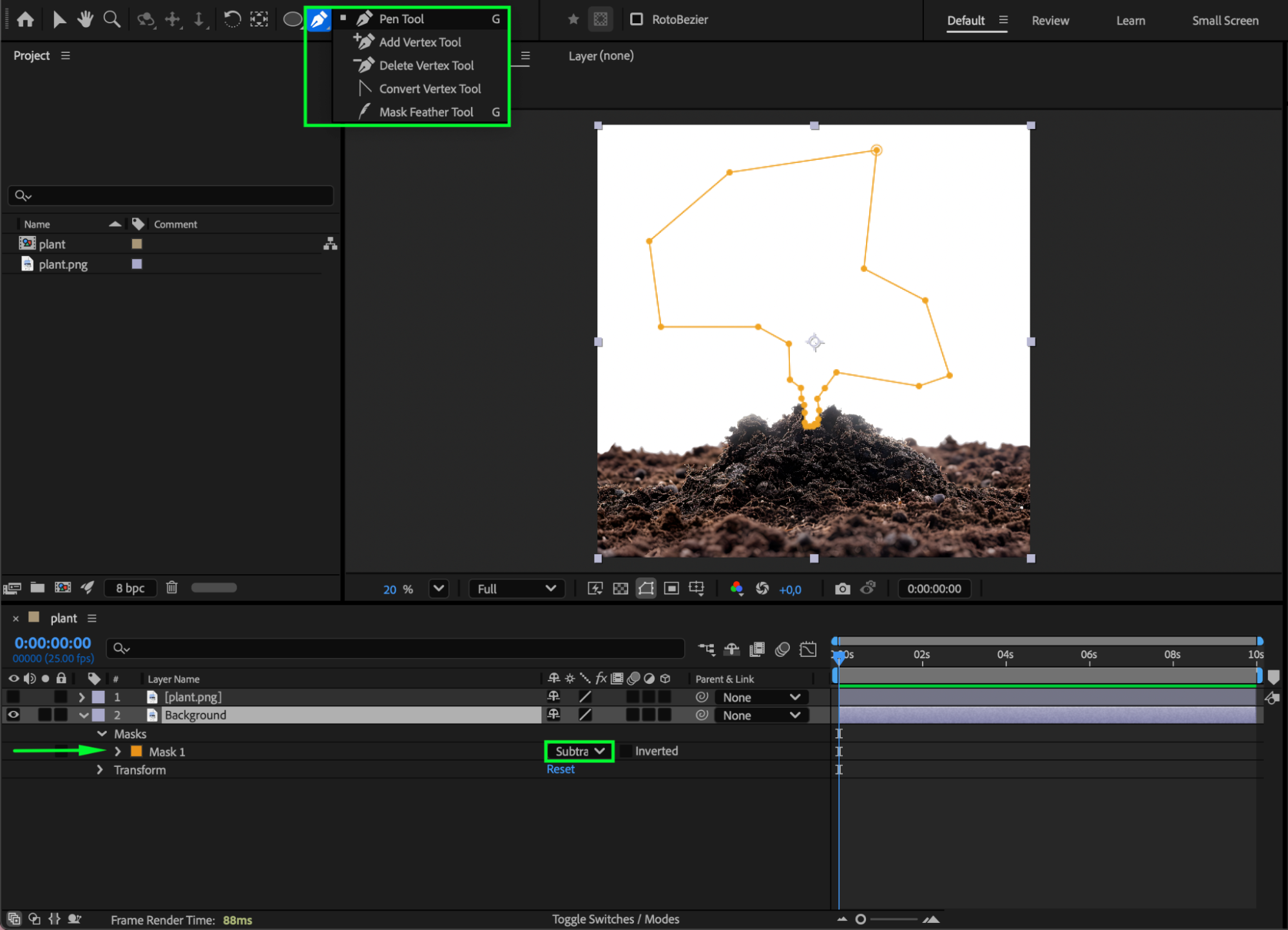 Duplicate the plant layer. Turn off the visibility (eye icon) of the top layer. Rename the bottom layer Background. Using the Pen Tool (G), create a mask around the plant so that only the ground (or pot) remains visible. Set the Mask Mode to Subtract.
