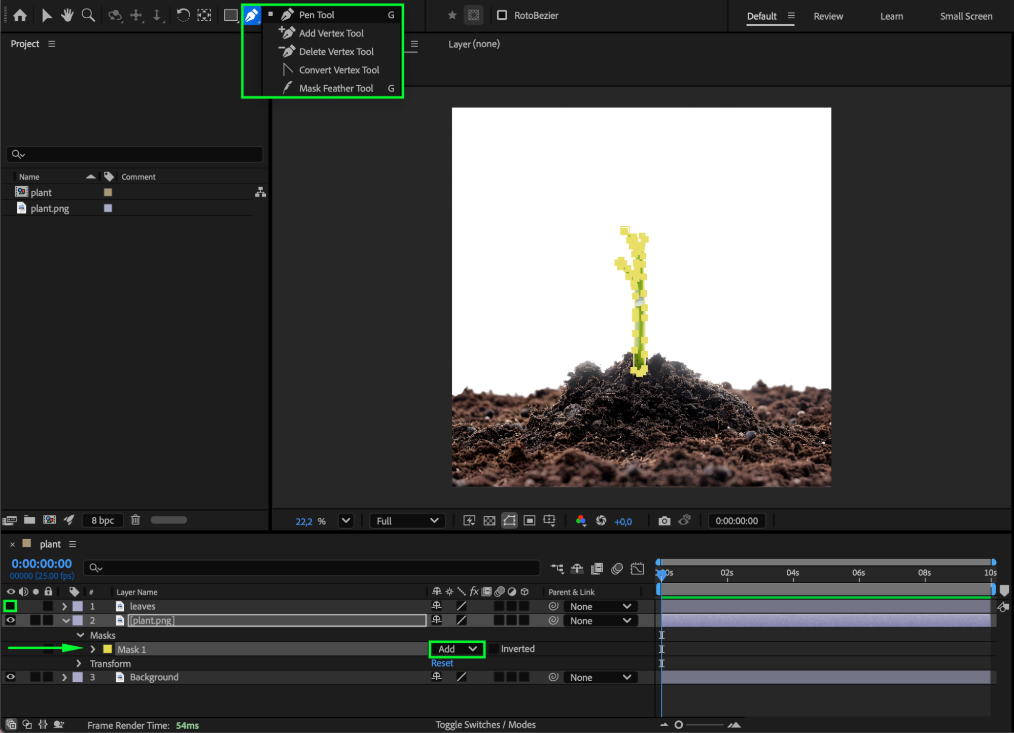 On the middle plant layer, use the Pen Tool (G) to create a mask around the plant stem. Set Mask Mode = Add. This layer will be used to animate the stem growth.