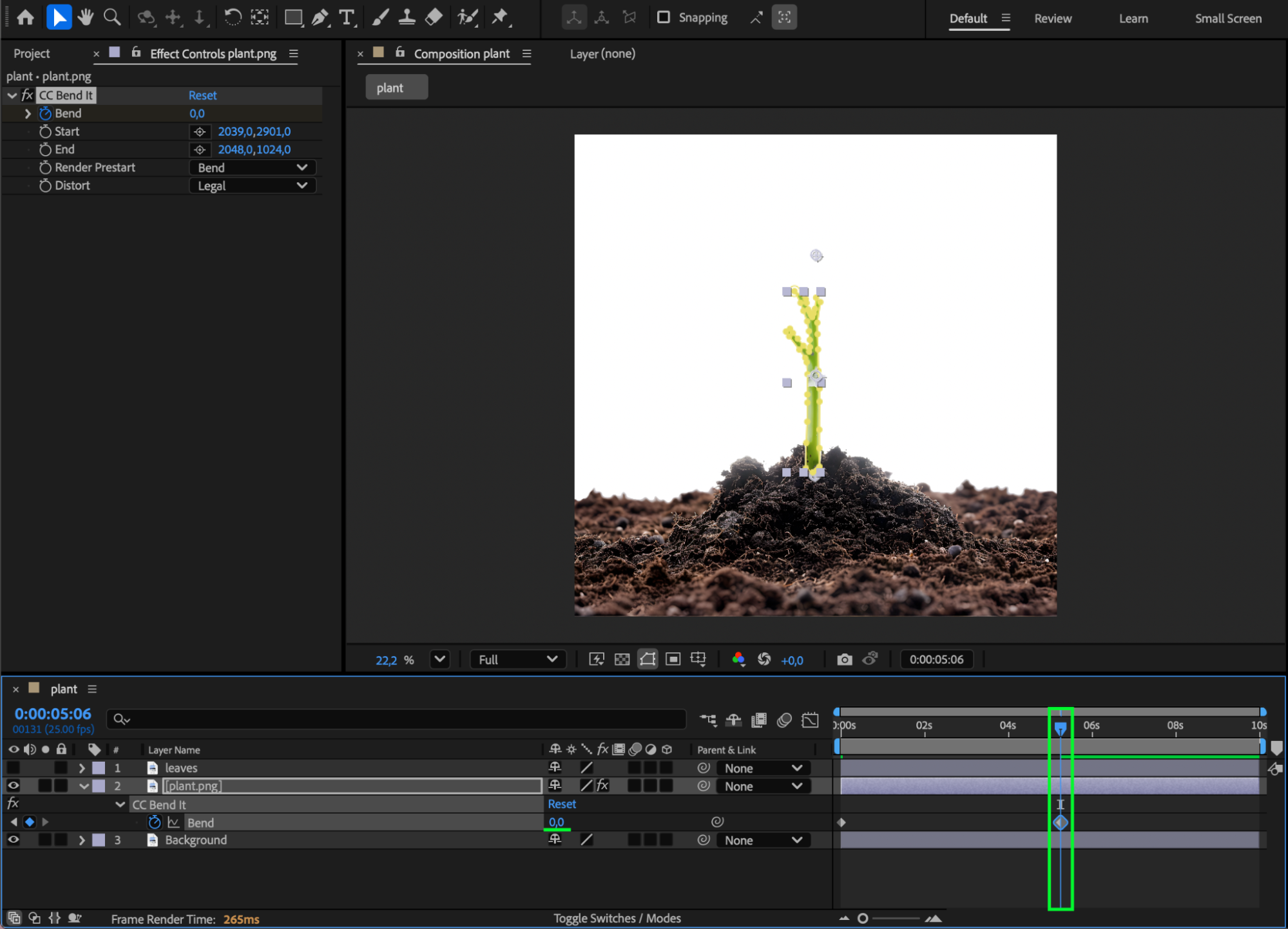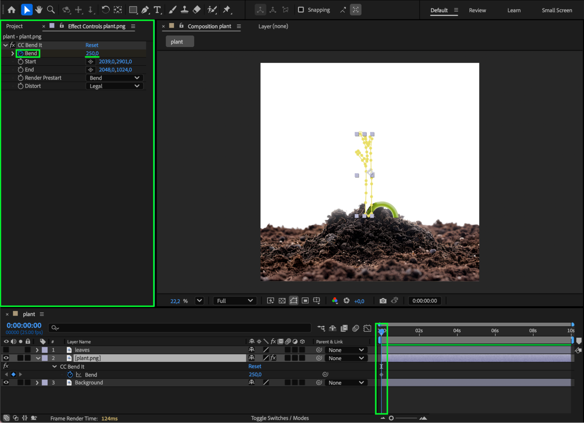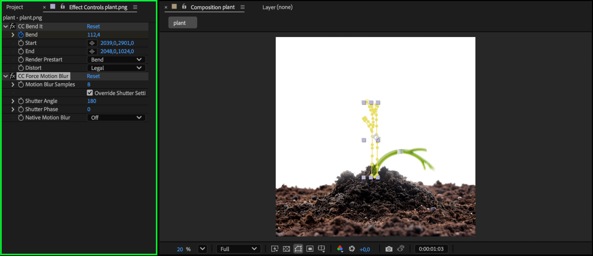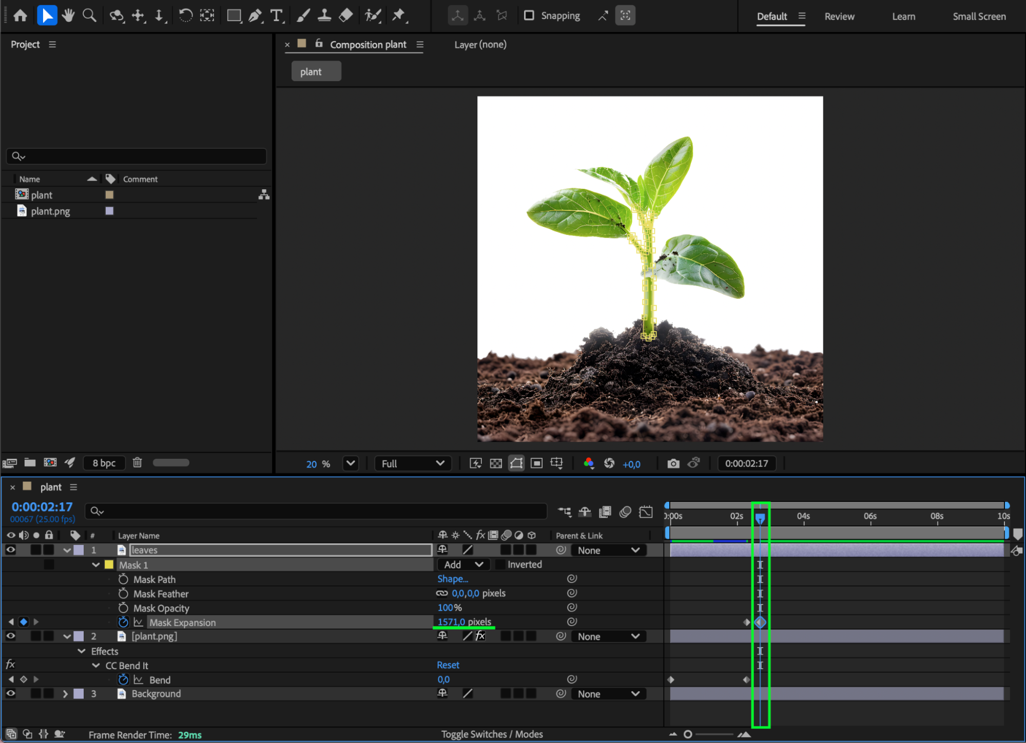 Press Spacebar to preview your animation. Adjust bend values, mask timing, or easing until the plant growth feels smooth and organic.