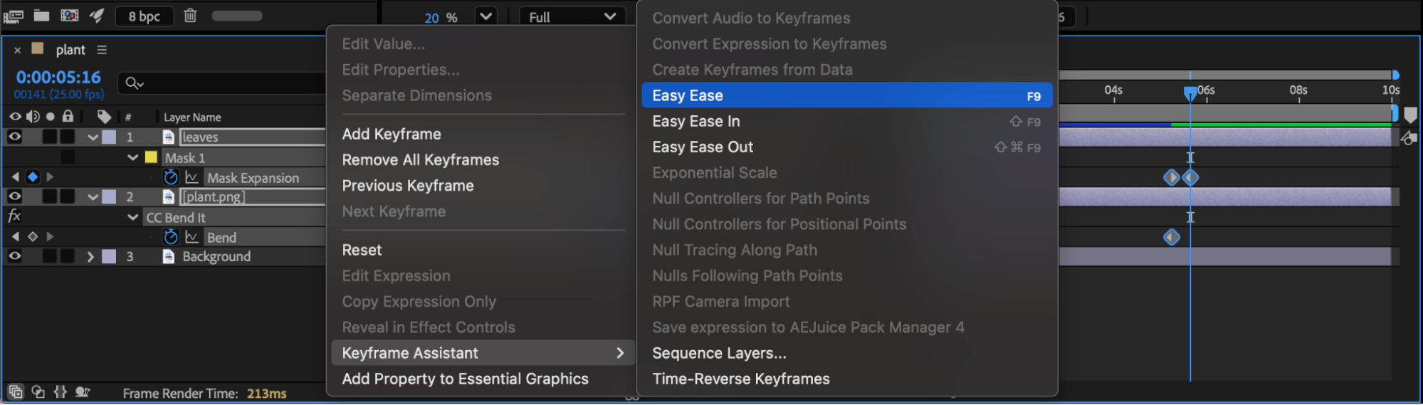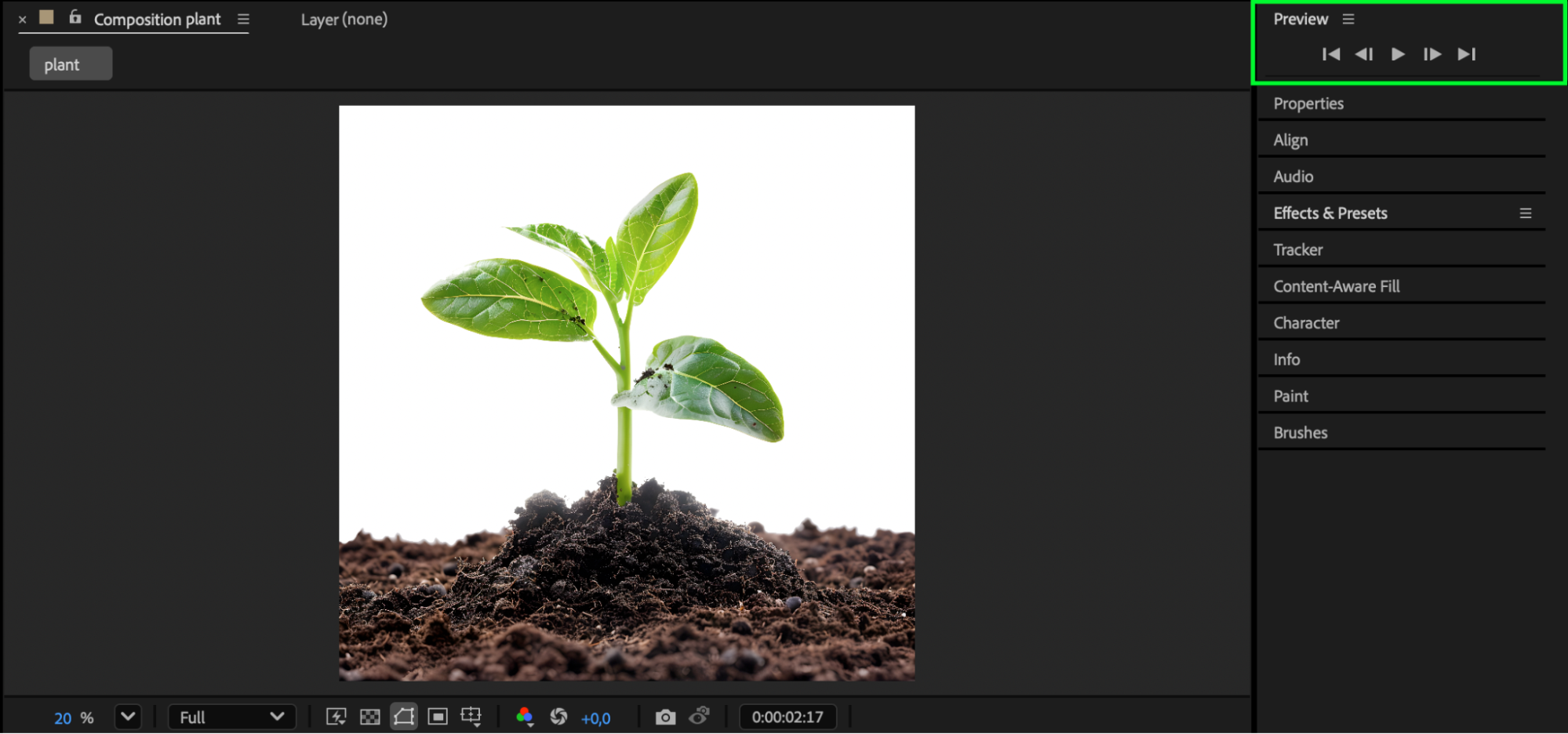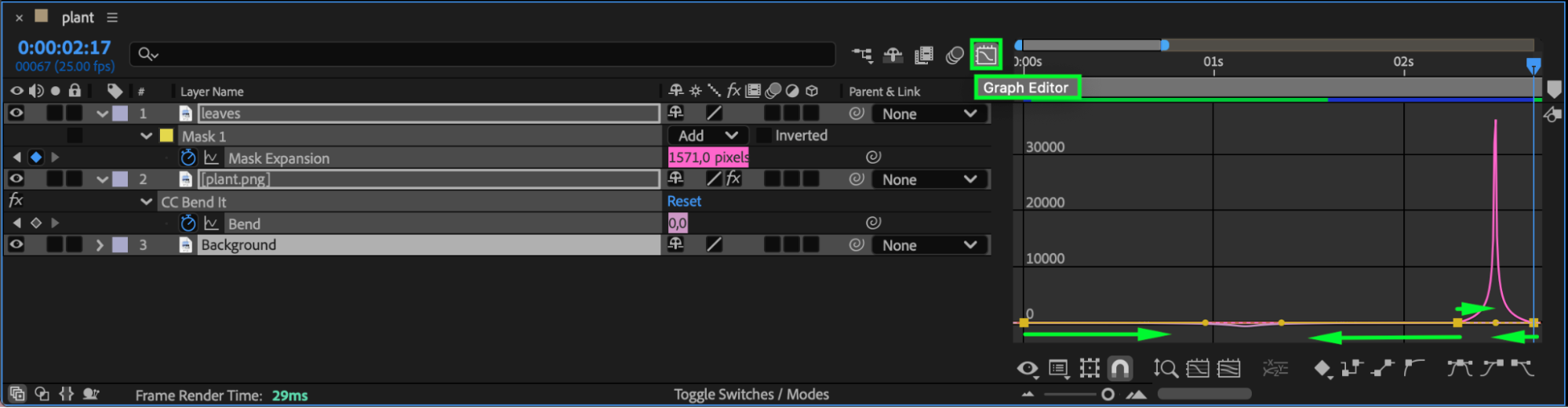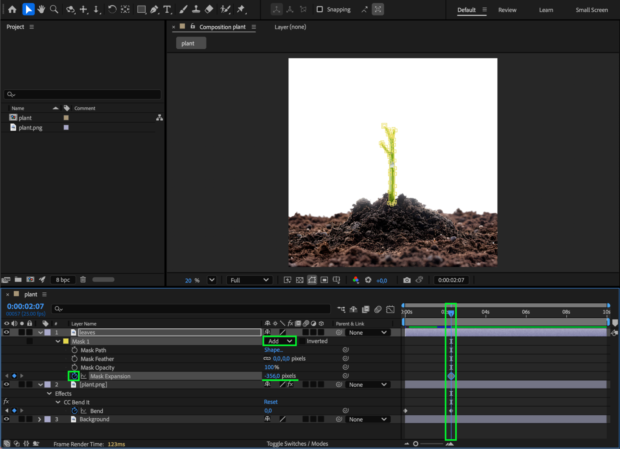 Press Spacebar to preview your animation. Adjust bend values, mask timing, or easing until the plant growth feels smooth and organic.