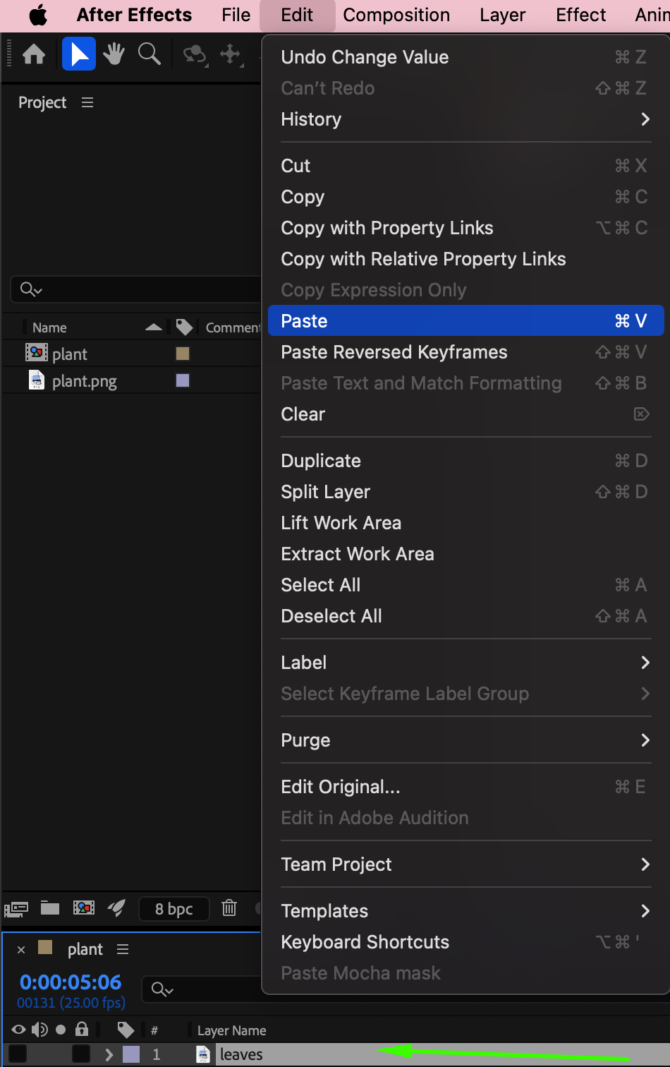 Copy the mask from the stem layer and paste it onto the Leaves layer. This keeps the leaves aligned correctly with the stem.