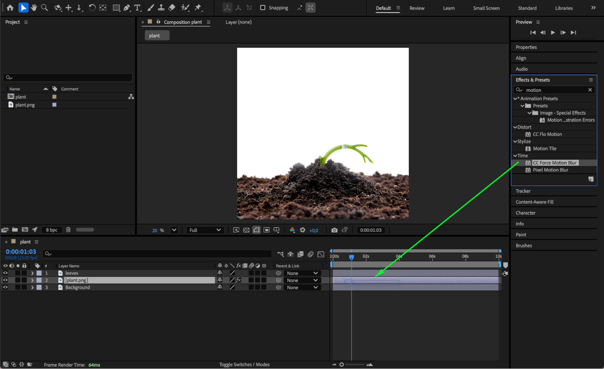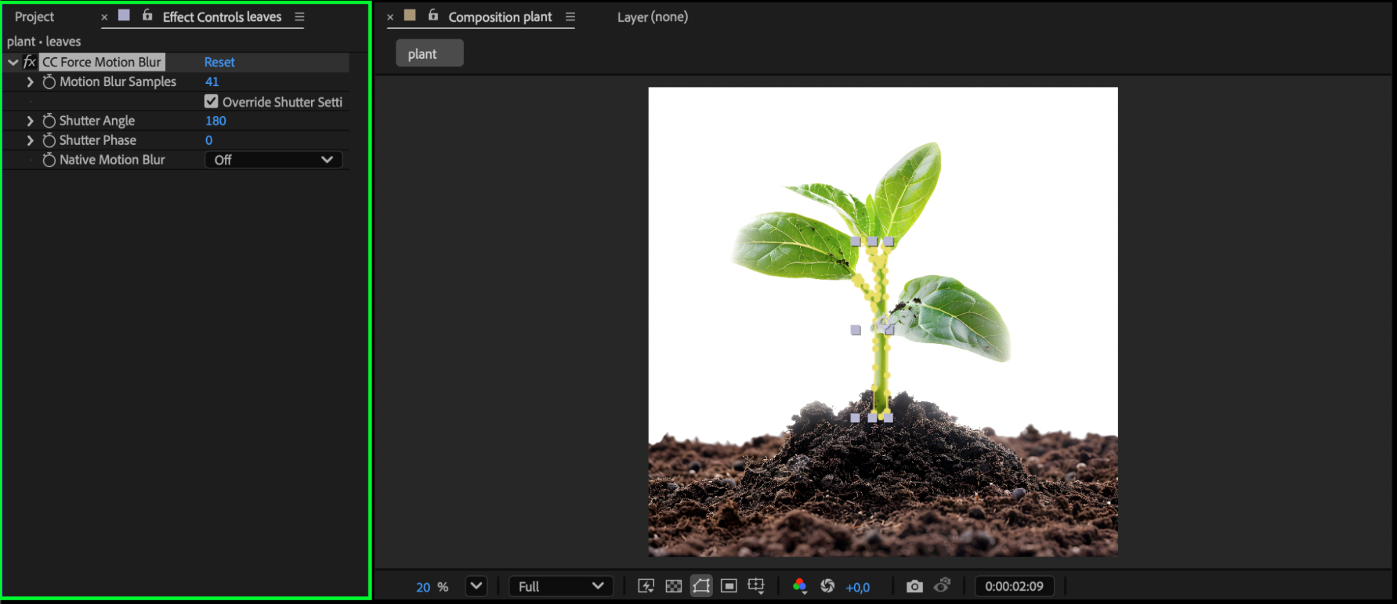 Apply CC Force Motion Blur to the Plant and Leaves layers. This adds subtle blur that enhances the realism of the growth animation.