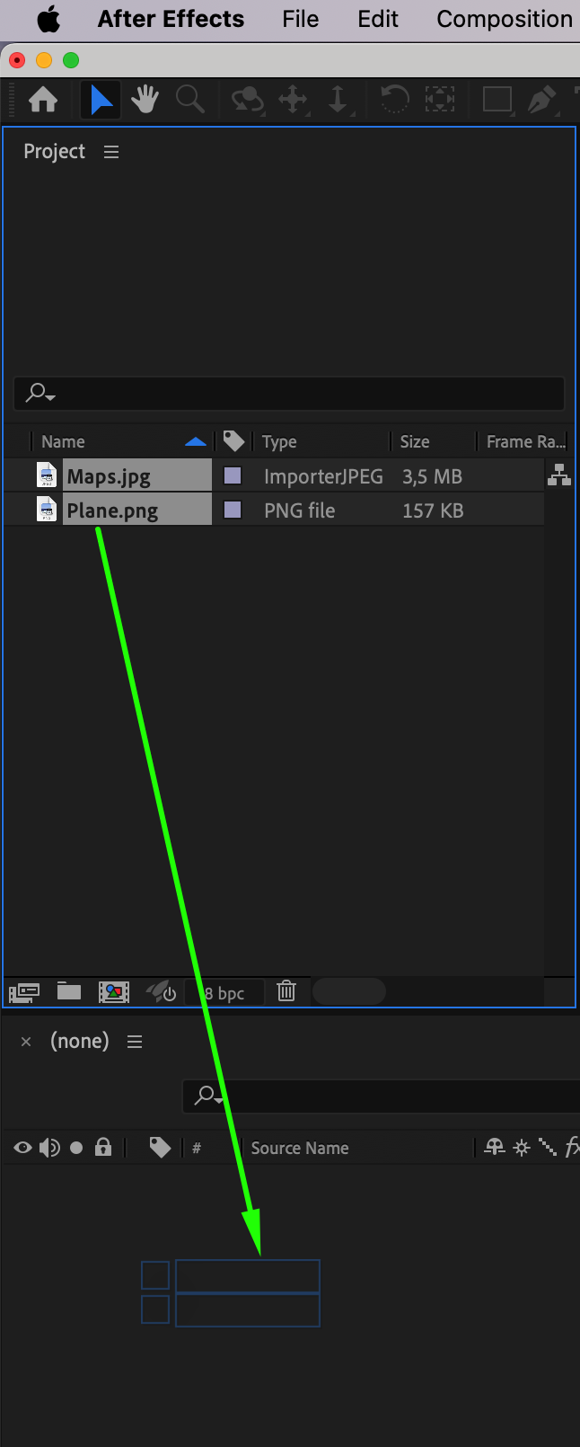 Drag your imported files onto the timeline to automatically create a new composition. This step sets up your workspace and allows you to start editing your project right away.