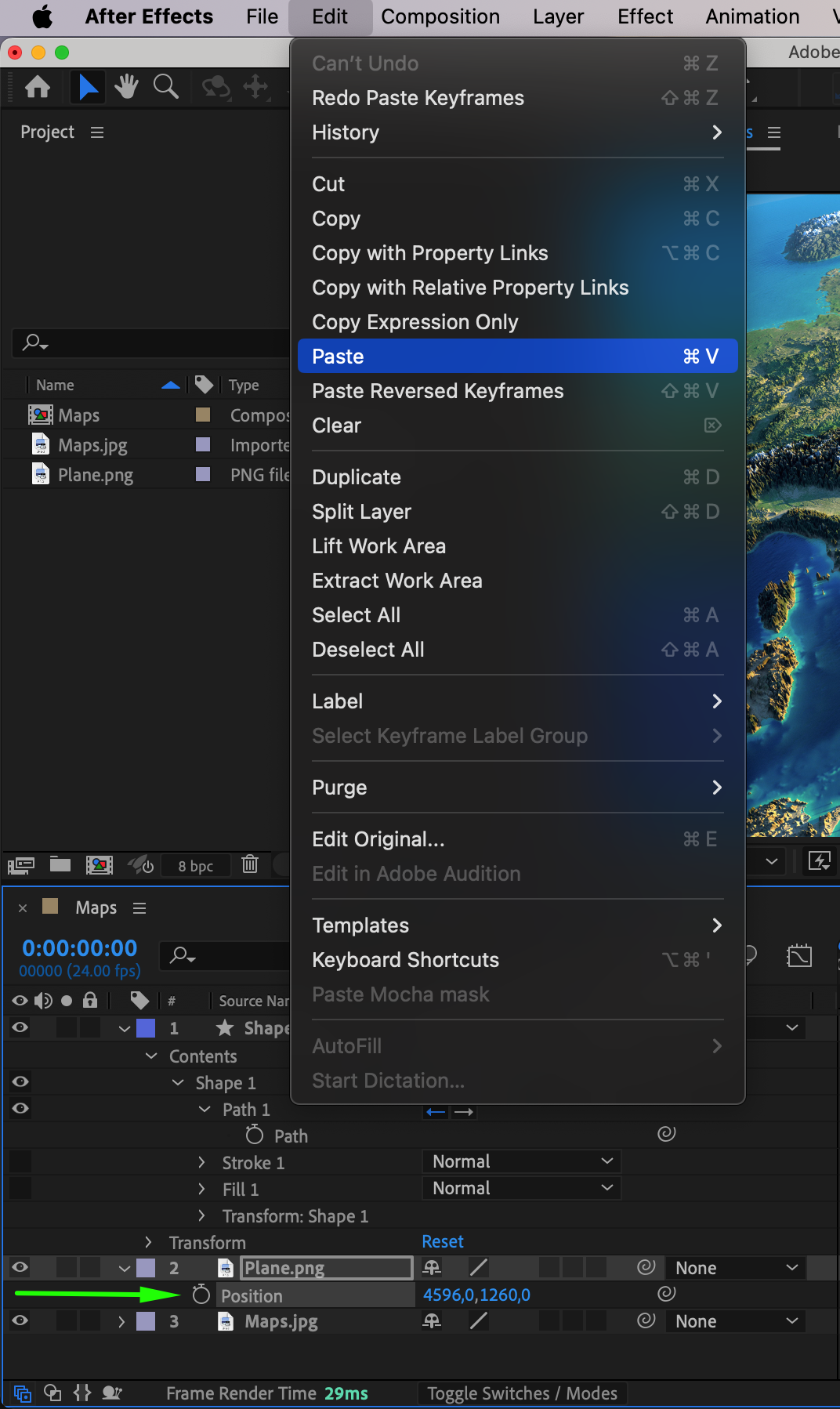 Select the layer containing the object you want to animate. Press “P” to open the Position property, then paste the copied path using “Ctrl/Cmd + V”. This applies the path data to your object, making it follow the trajectory you created.
