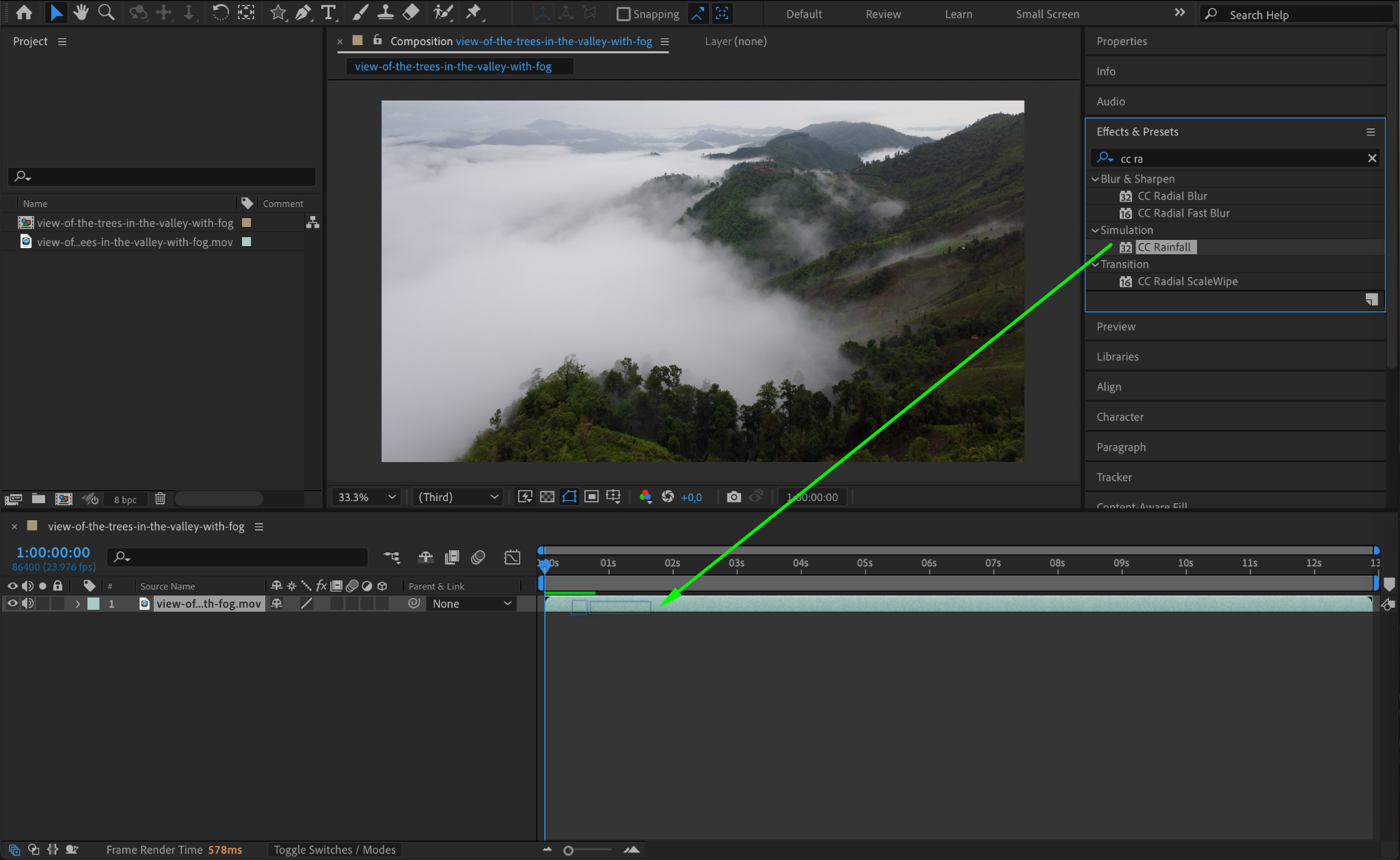In the Effect & Presets panel, search for the effect CC Rainfall. Once you locate it, drag and drop it onto your video layer in the timeline. The rain effect will be applied to the layer, but you’ll need to adjust its settings to achieve the desired look for your scene.