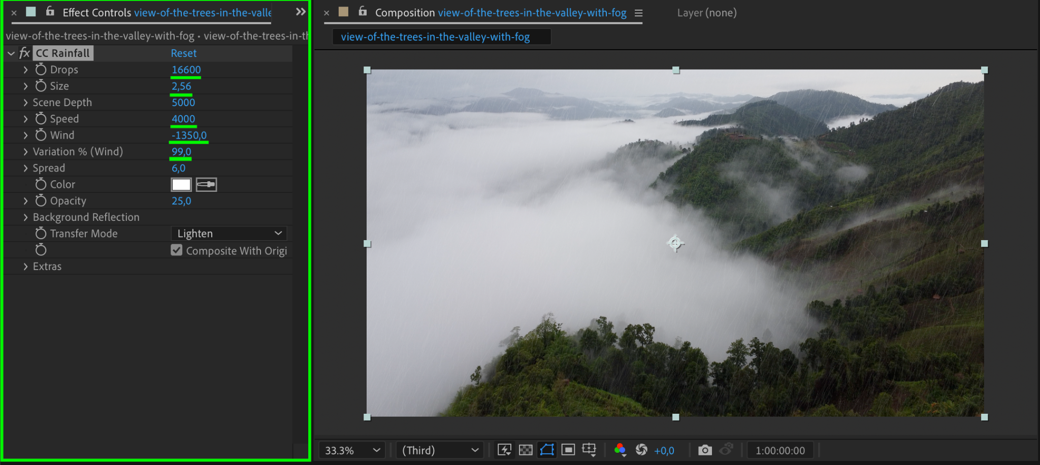 With the CC Rainfall effect applied, adjust the parameters in the Effect Controls panel to achieve the look you want: