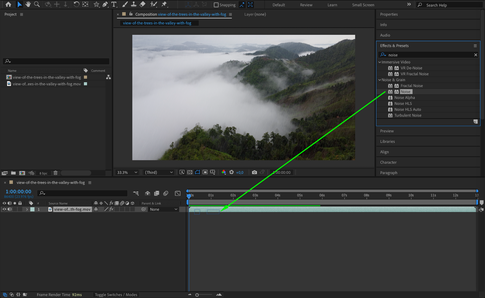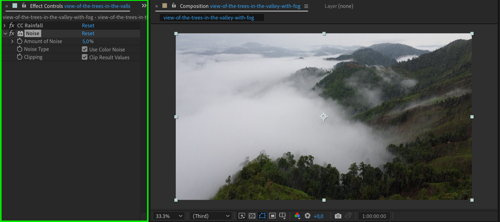To further enhance the rain effect and make it blend better with your video, apply a Noise effect. This will add grain to the footage, simulating the visual texture of real rain hitting surfaces. In the Effect & Presets panel, search for Noise and drag it onto the video layer. Adjust the noise settings to match the look of the rain.