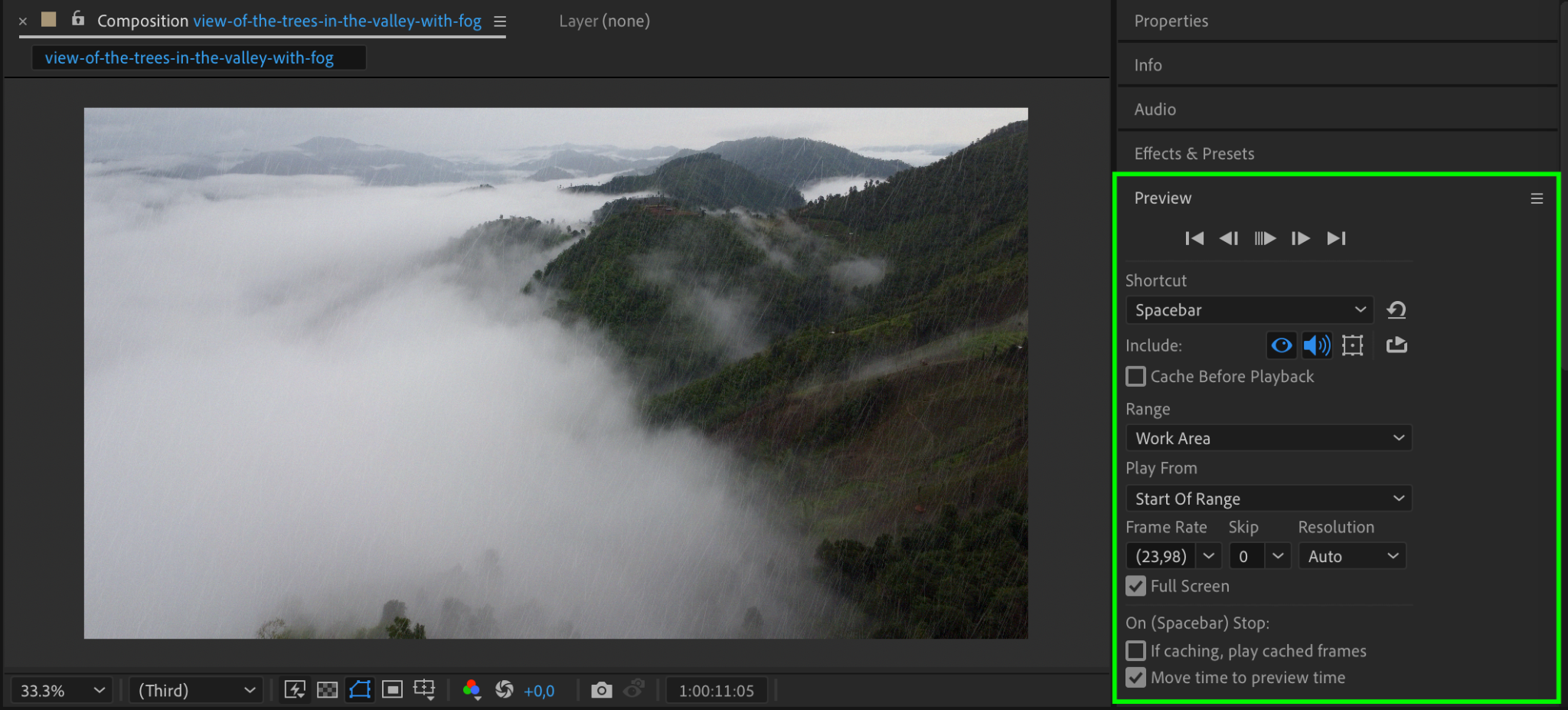 Press the Spacebar or use the Preview panel to review your animation. This step is essential for evaluating how the rain effect interacts with your video. Make adjustments to the speed, size, or direction of the rain if necessary, based on your preview.