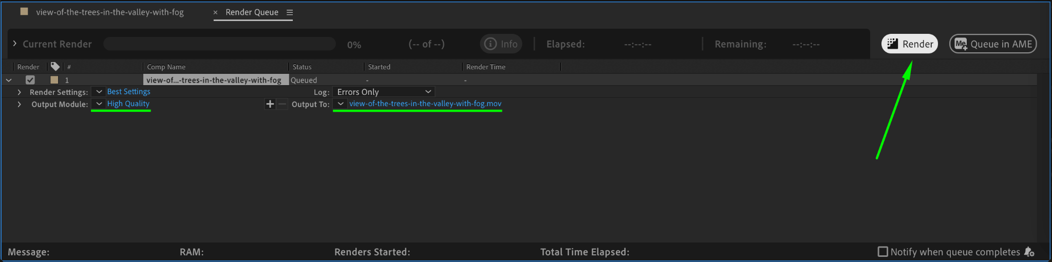 Once you’re satisfied with the rain effect and your video looks as desired, it’s time to render. Go to Composition > Add to Render Queue and adjust your output settings, such as format and resolution. Once everything is set, click Render to export your final composition.