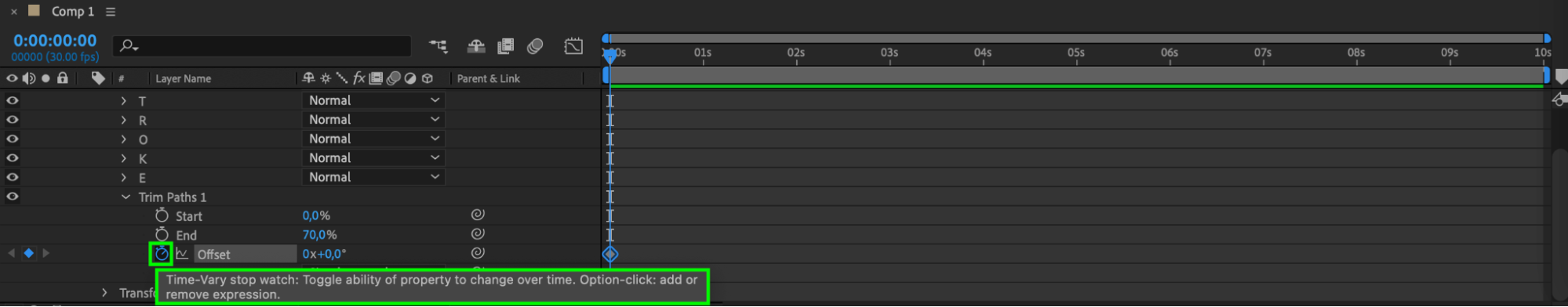 Move the playhead to the beginning of the composition and click the stopwatch icon next to Offset. Set the value to 0.