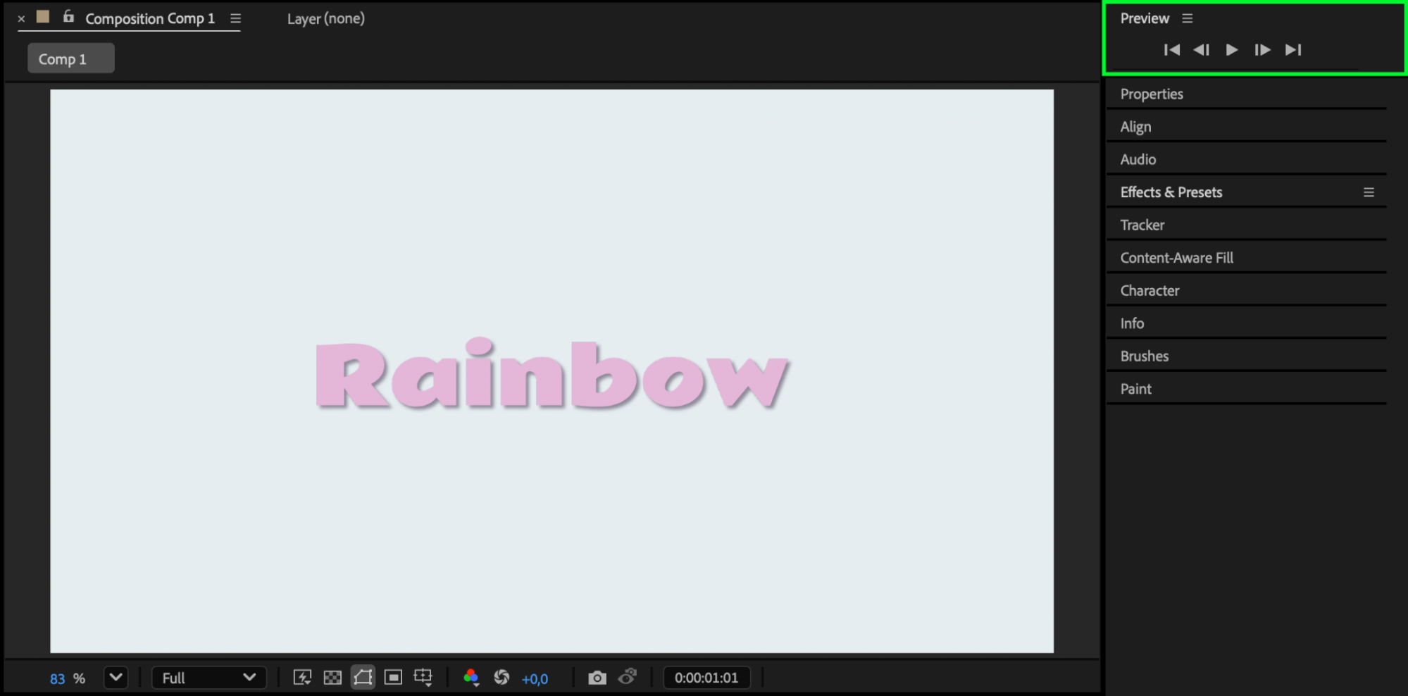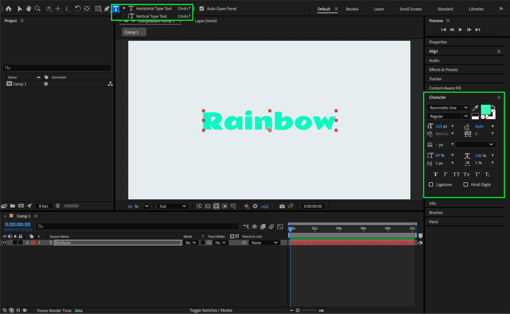 Select the Type Tool (Ctrl/Cmd + T) and click anywhere in the Composition panel to type your text. Adjust the font, size, and alignment from the Character panel.