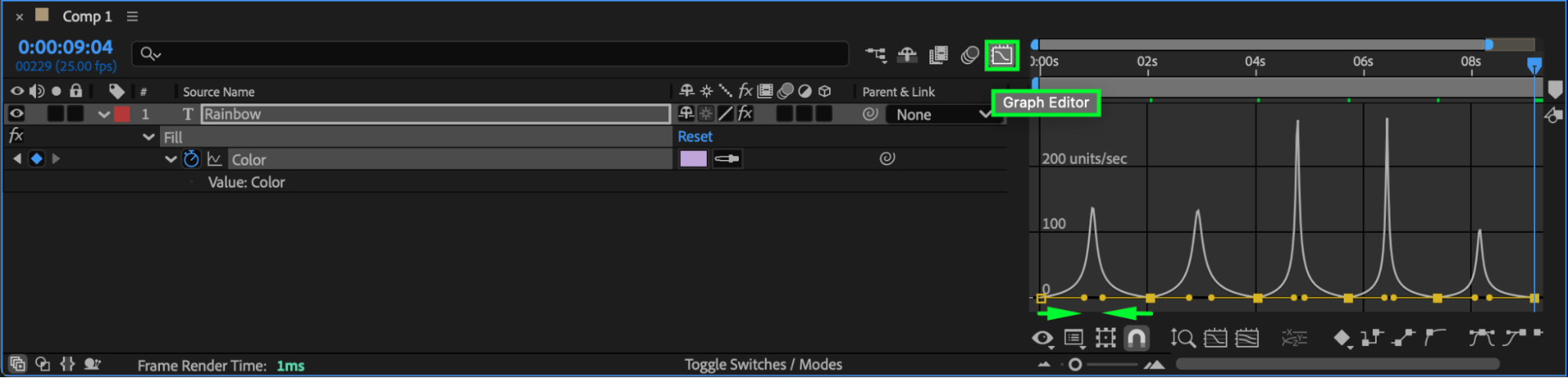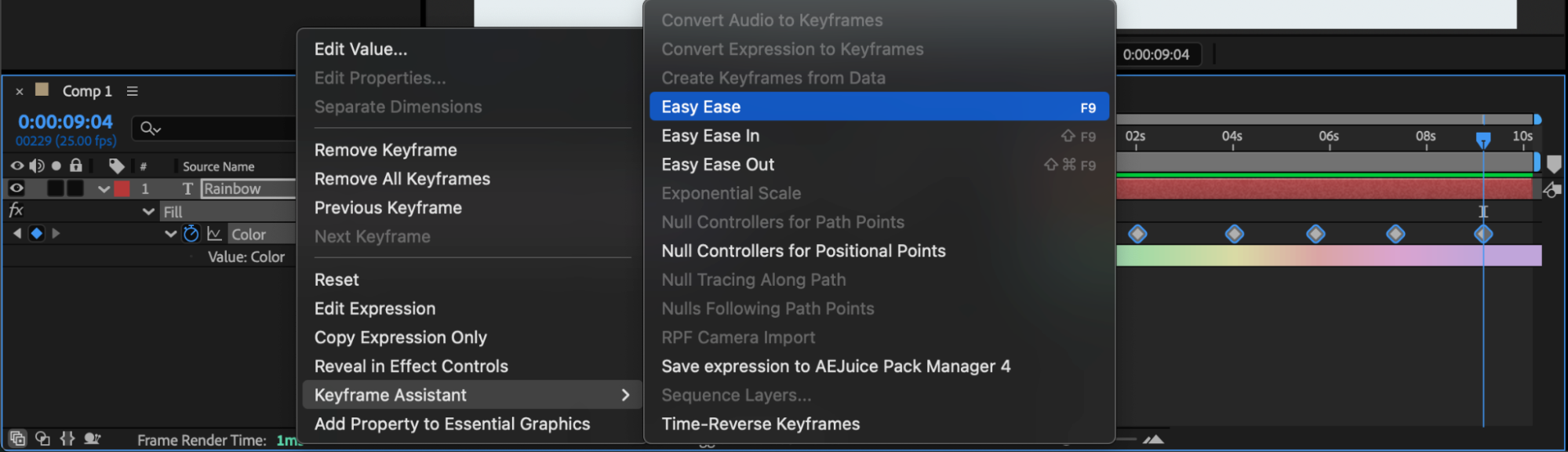 Select your color keyframes, right-click, and choose Keyframe Assistant > Easy Ease to make the color transition smoother. You can also open the Graph Editor to fine-tune the animation speed.