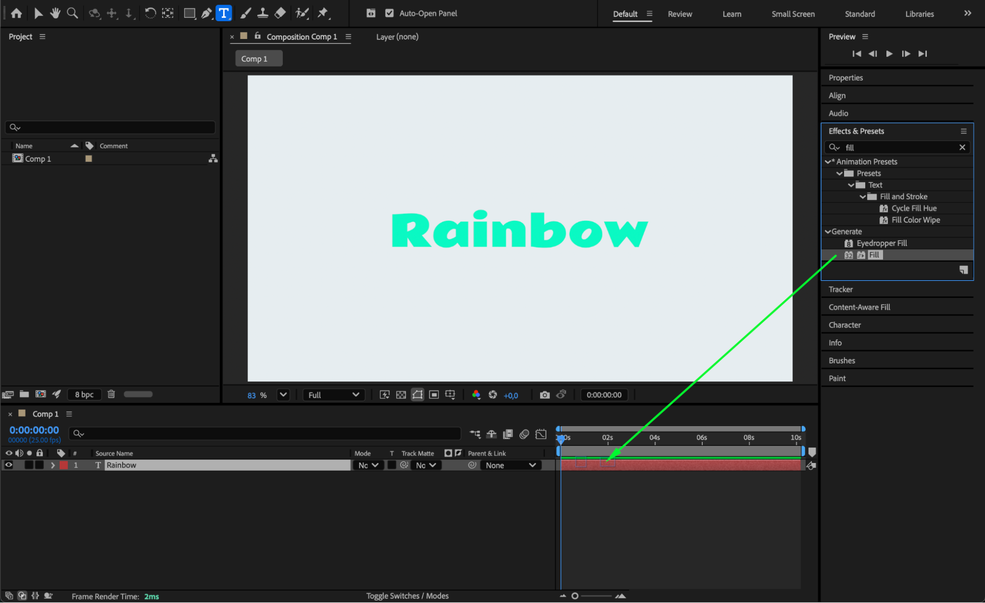 With the text layer selected, go to the Effects & Presets panel and search for Fill. Drag it onto your text layer. In the Effect Controls panel, click the color box to choose your starting color.
