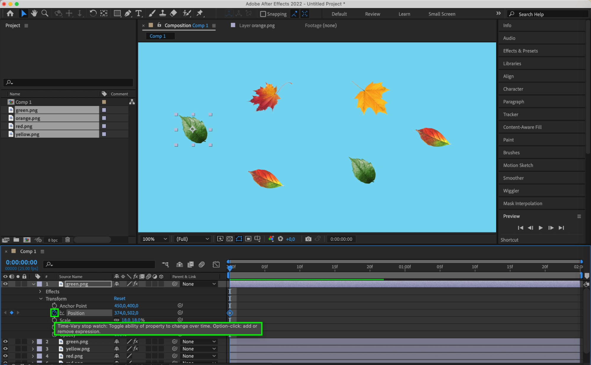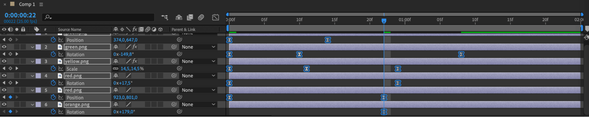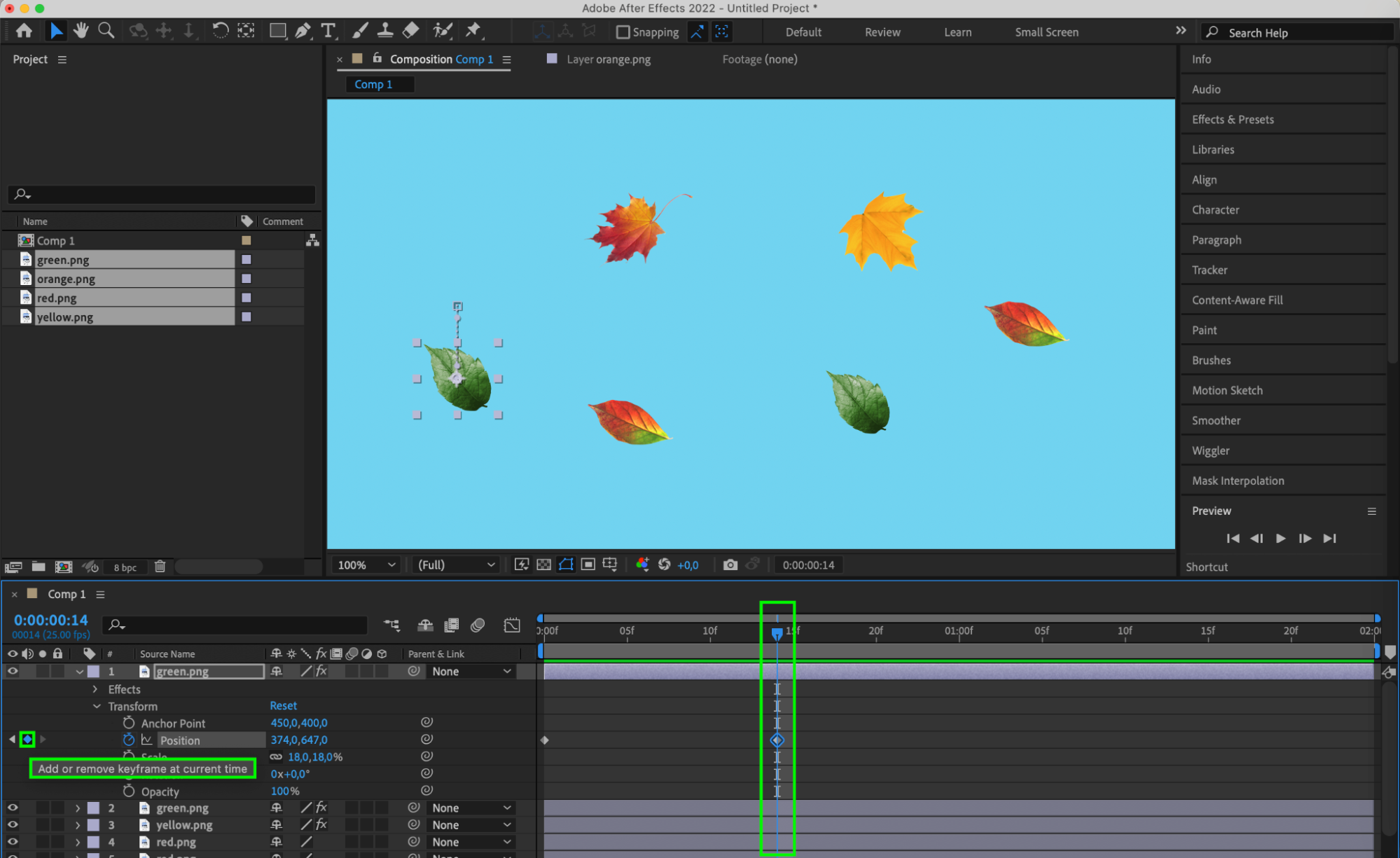 Select the layer you want to animate and press ‘P’ for position, ‘S’ for scale, ‘R’ for rotation, and ‘T’ for opacity. Click on the stopwatch icon next to each property to create keyframes. Move the playhead to a different time and adjust the property values to create animation.