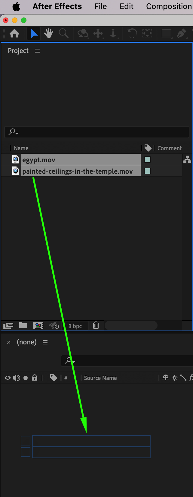 To begin, import the files you want to use in your composition. Navigate to File > Import > File, select your media, and click Open. These files can include video clips, images, or other media assets needed for your project.