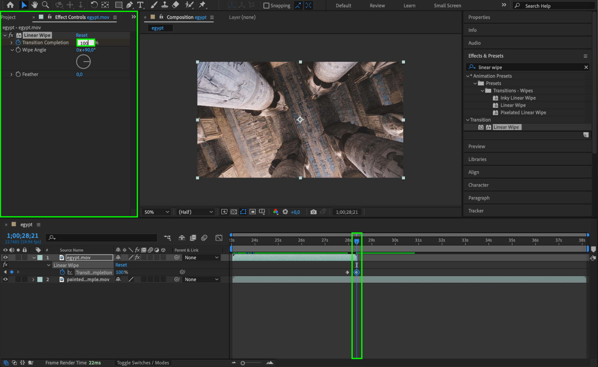 Press the Spacebar to play back your composition and preview the Linear Wipe effect. Check the timing and appearance, and make any necessary adjustments in the Effect Controls panel or timeline.