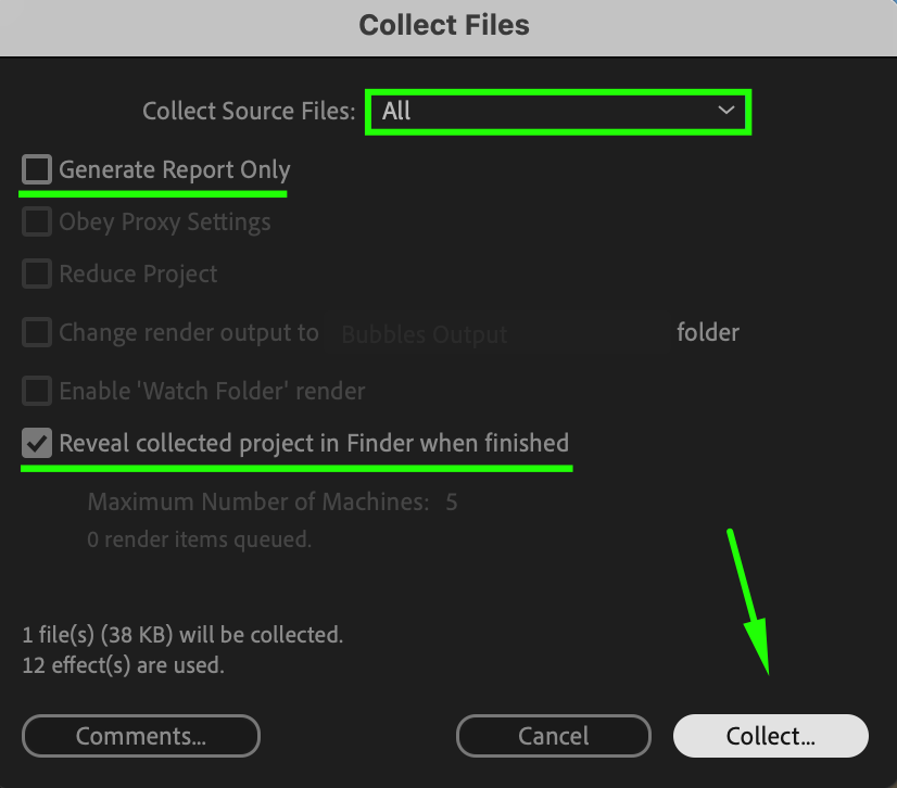 In the Collect Files window, set Collect Source Files to All to include every asset used in the project. Uncheck Generate Report Only and check Reveal Collected Project in Finder When Finished. This ensures that After Effects gathers all necessary files, and the final folder opens automatically when the process is complete. Click Collect to proceed.