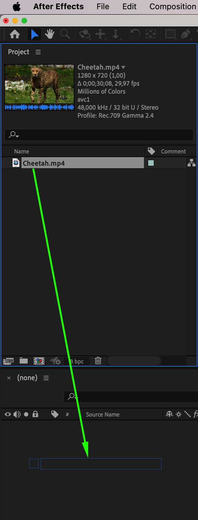 Drag your video from the Project panel to the Timeline panel. This will create a new composition with the same settings as your video.