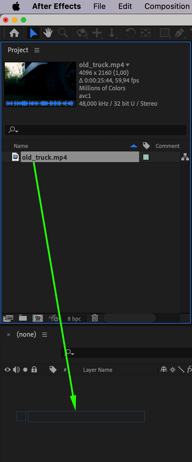 Go to File > Import > File and select the video you want to censor (for example, a video with a car and visible license plate). Once imported, drag it onto the Timeline to start working with it.