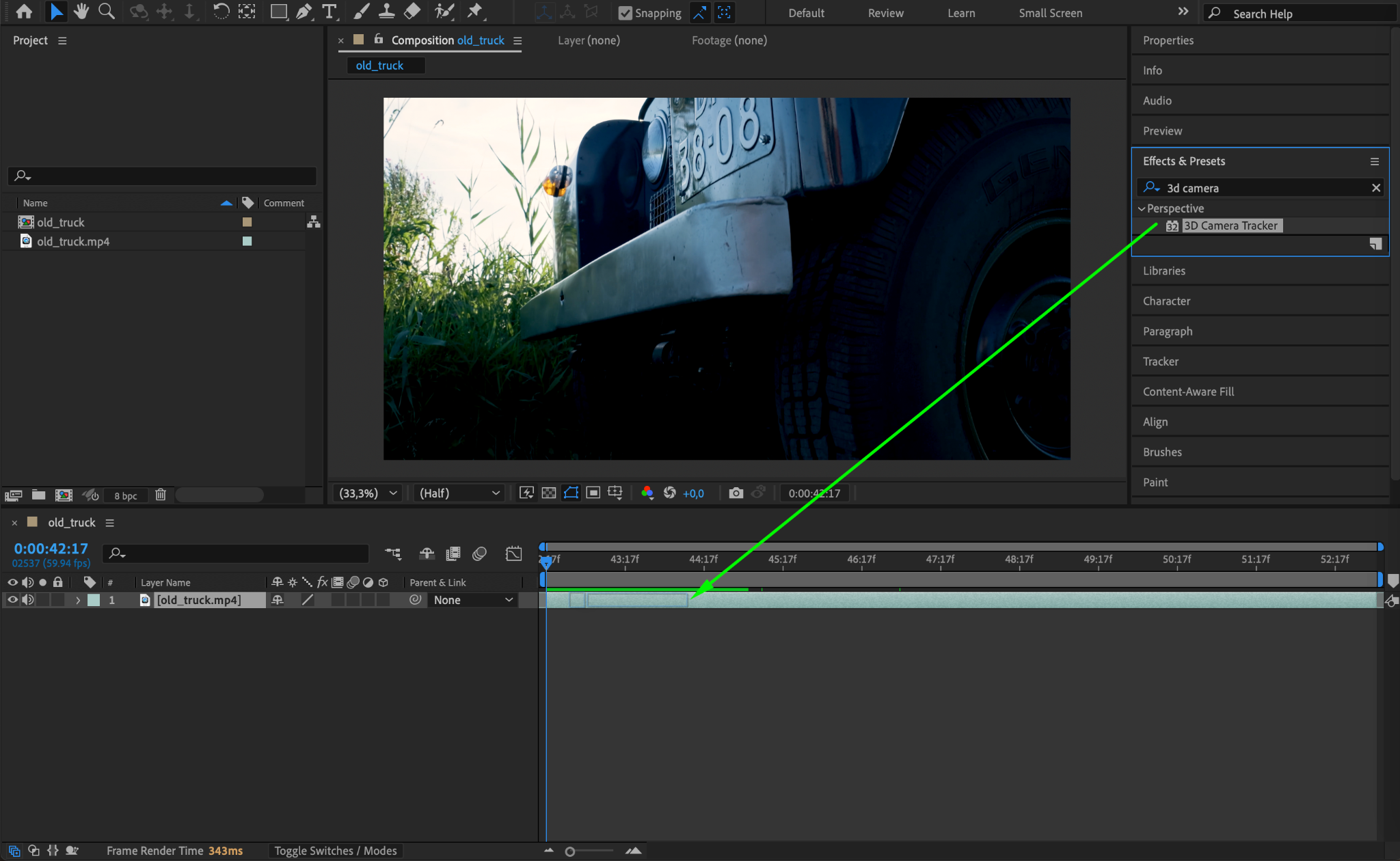 In the Effects & Presets panel, search for the 3D Camera Tracker effect. Drag and drop this effect onto your video layer in the Timeline. This will analyze the video to track the movement of the camera.