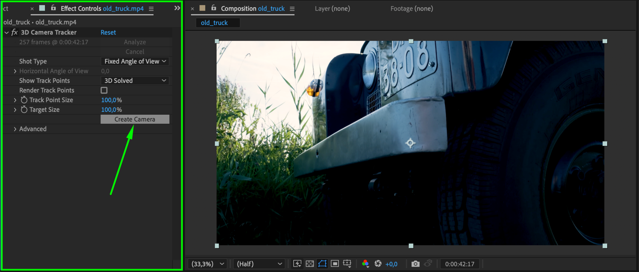 Once the analysis is complete, go to the Effect Controls panel and click the Create Camera button. This creates a camera based on the movement of the footage, allowing you to add objects that move naturally within the scene.