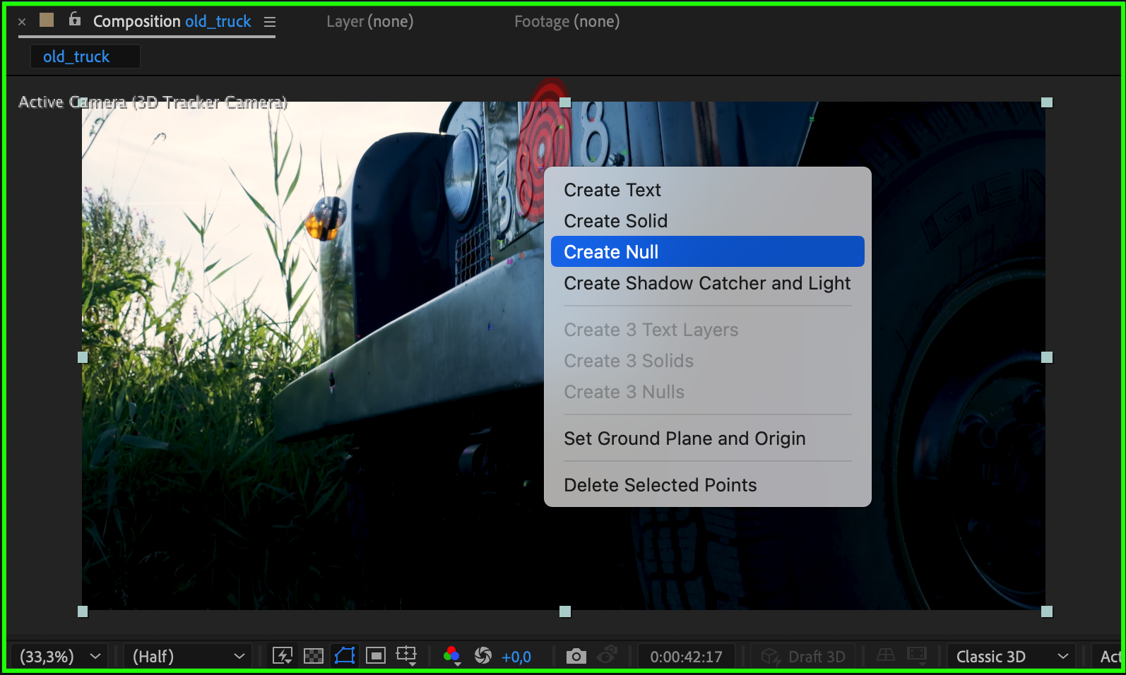 Hover your mouse over the composition panel and find the area of the license plate. Right-click on that area and select Create Null Object. The null object will store the tracking data so it can move with the footage.