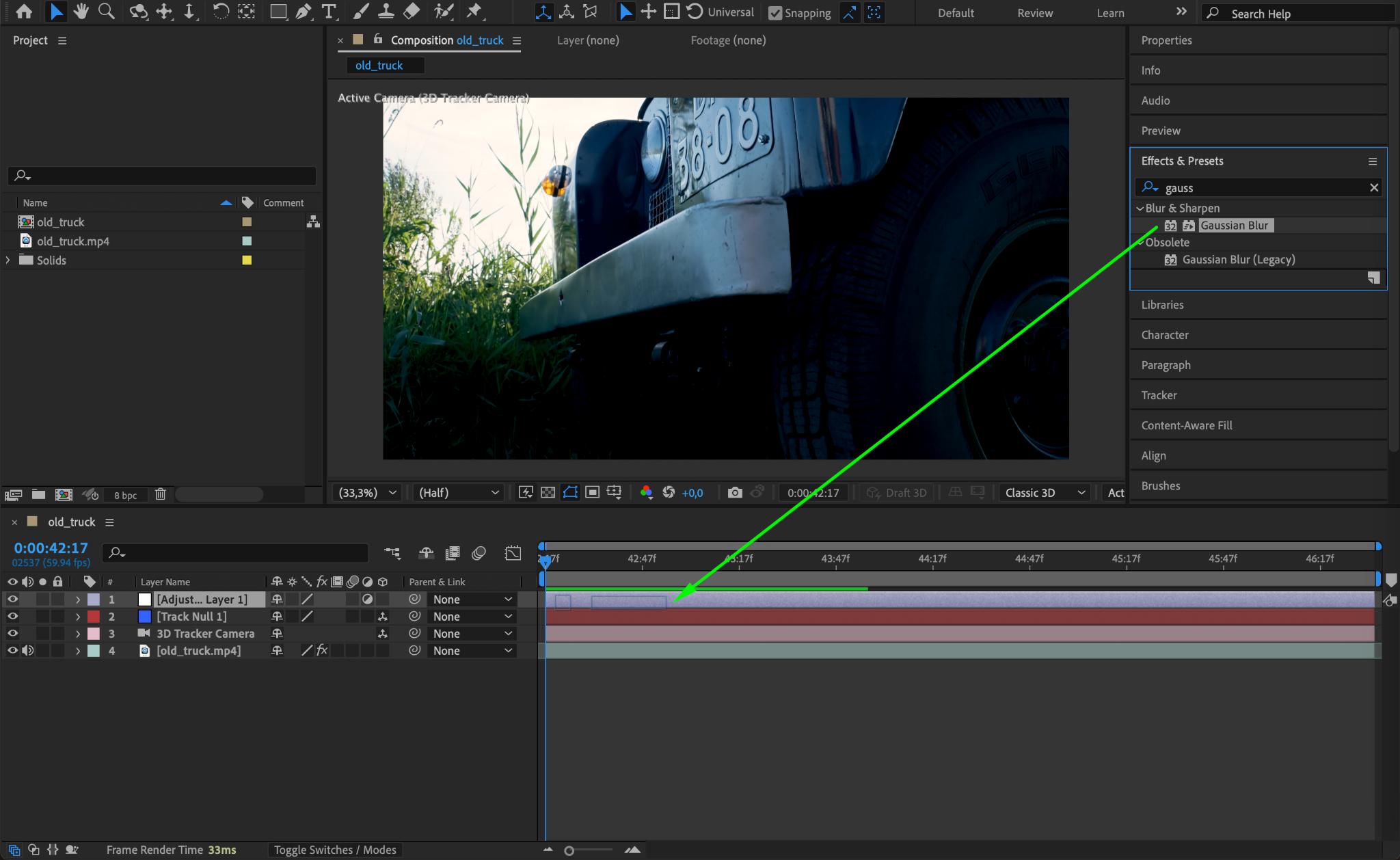 With the adjustment layer selected, apply the Gaussian Blur effect from the Effects & Presets panel. This will allow you to blur the area of the license plate.