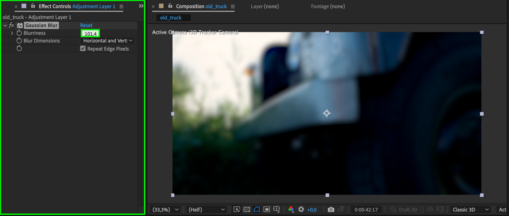Make the adjustment layer a 3D layer by clicking the 3D cube icon next to the layer name in the Timeline. This will allow the blur effect to follow the camera movement in three-dimensional space.
