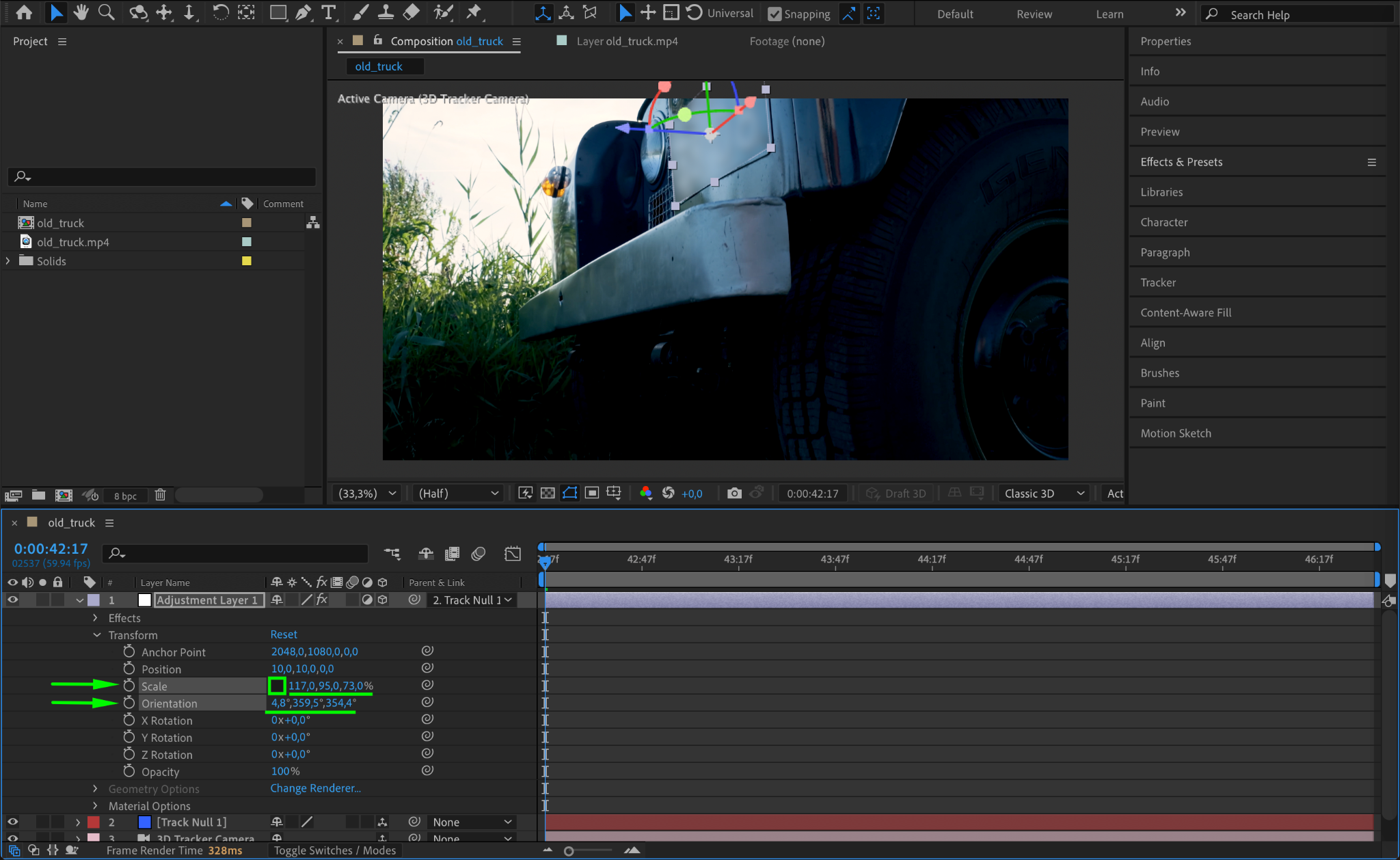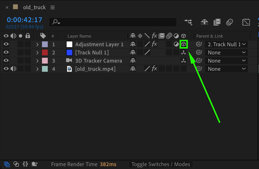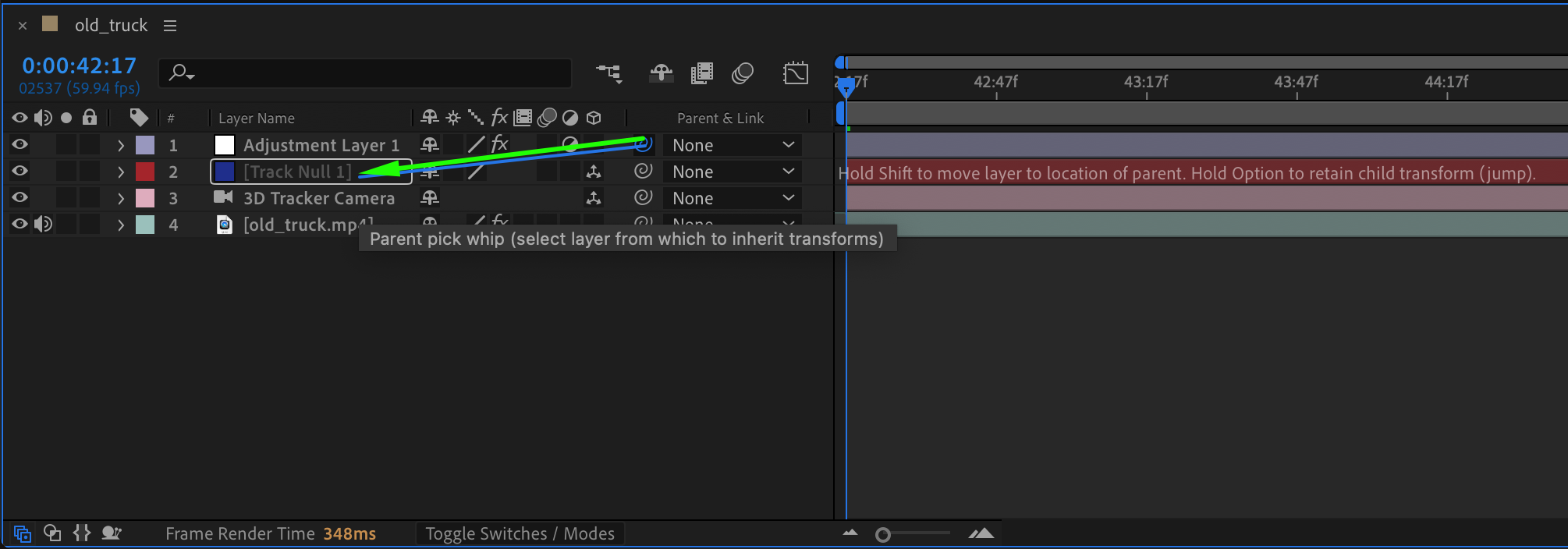 Use the Pick Whip Tool in the Timeline to parent the adjustment layer to the null object you created earlier. This links the adjustment layer to the null object, ensuring that it moves along with the tracked motion in the video.