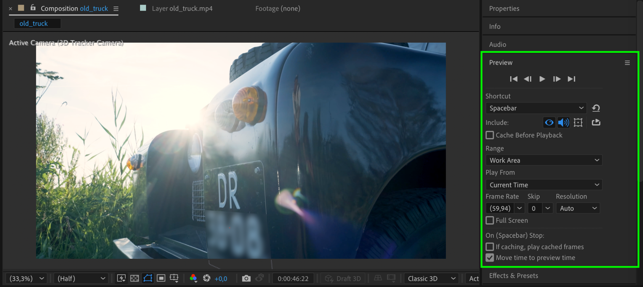 Press Spacebar to preview the effect in the Composition panel. Check if the blur correctly covers the license plate and moves with the footage. Adjust the layer and keyframe settings if needed.
