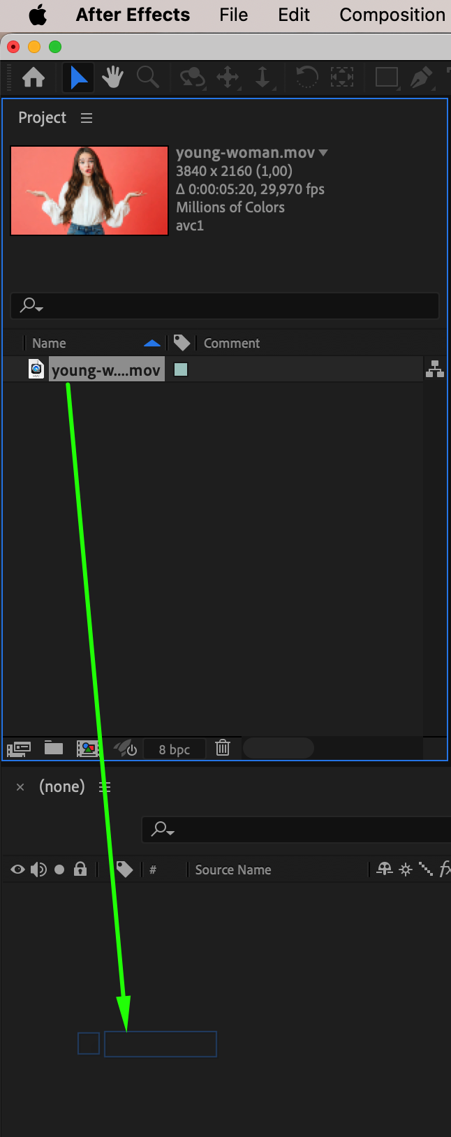 Go to File > Import > File, select your video file, and drag it onto the Timeline. This will create a new composition with your video as the main layer.