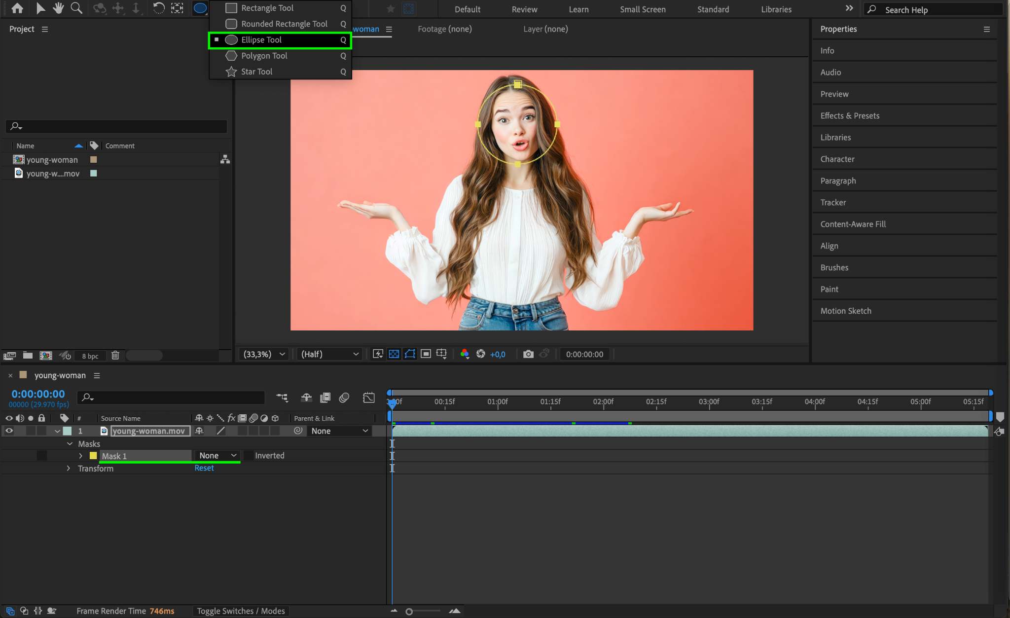 Select the video layer and choose the Ellipse Tool (Q) from the toolbar. Draw a mask around the face. In the Mask settings, set the Mask Mode to None so it doesn’t affect the video yet.