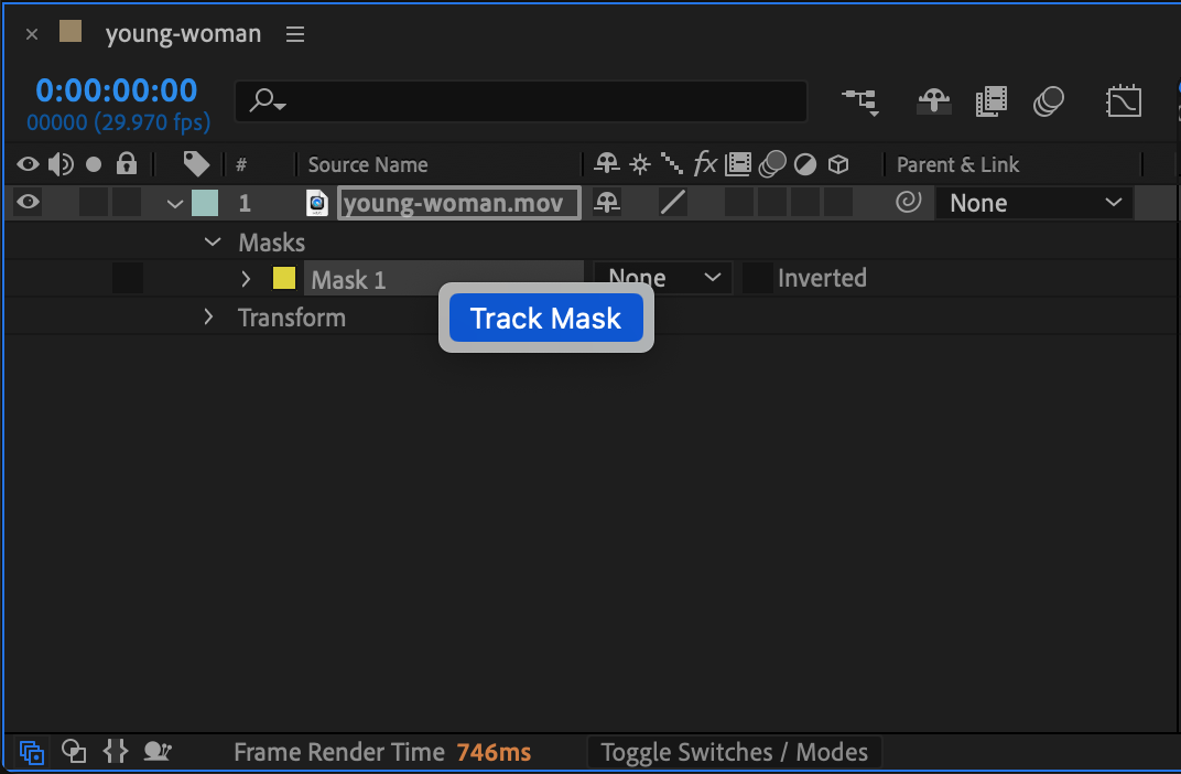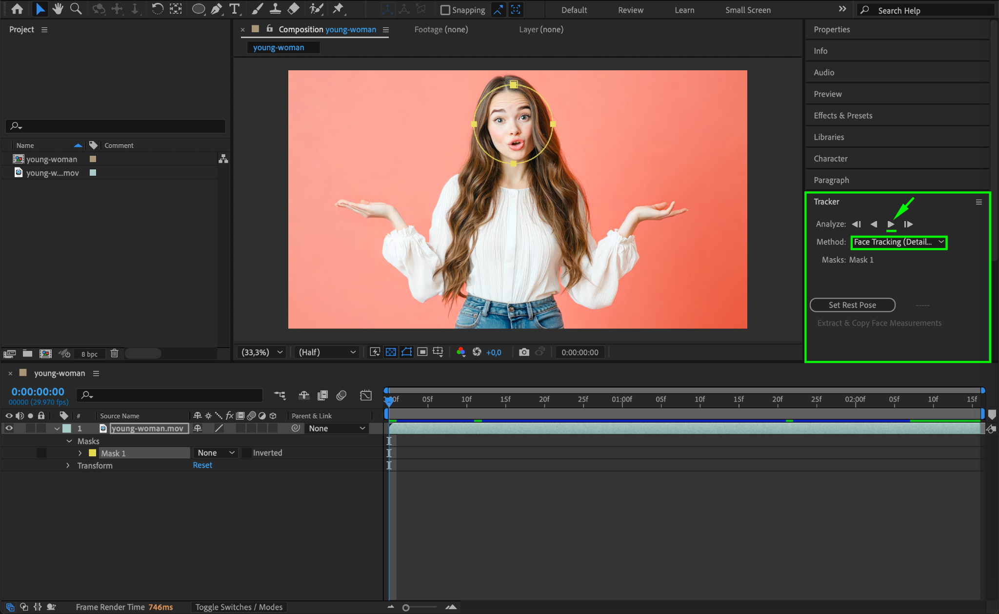 Right-click on the mask and select Track Mask. The Tracker Panel will open. In the Method dropdown, choose Face Tracking (Detailed Features) for accurate tracking.