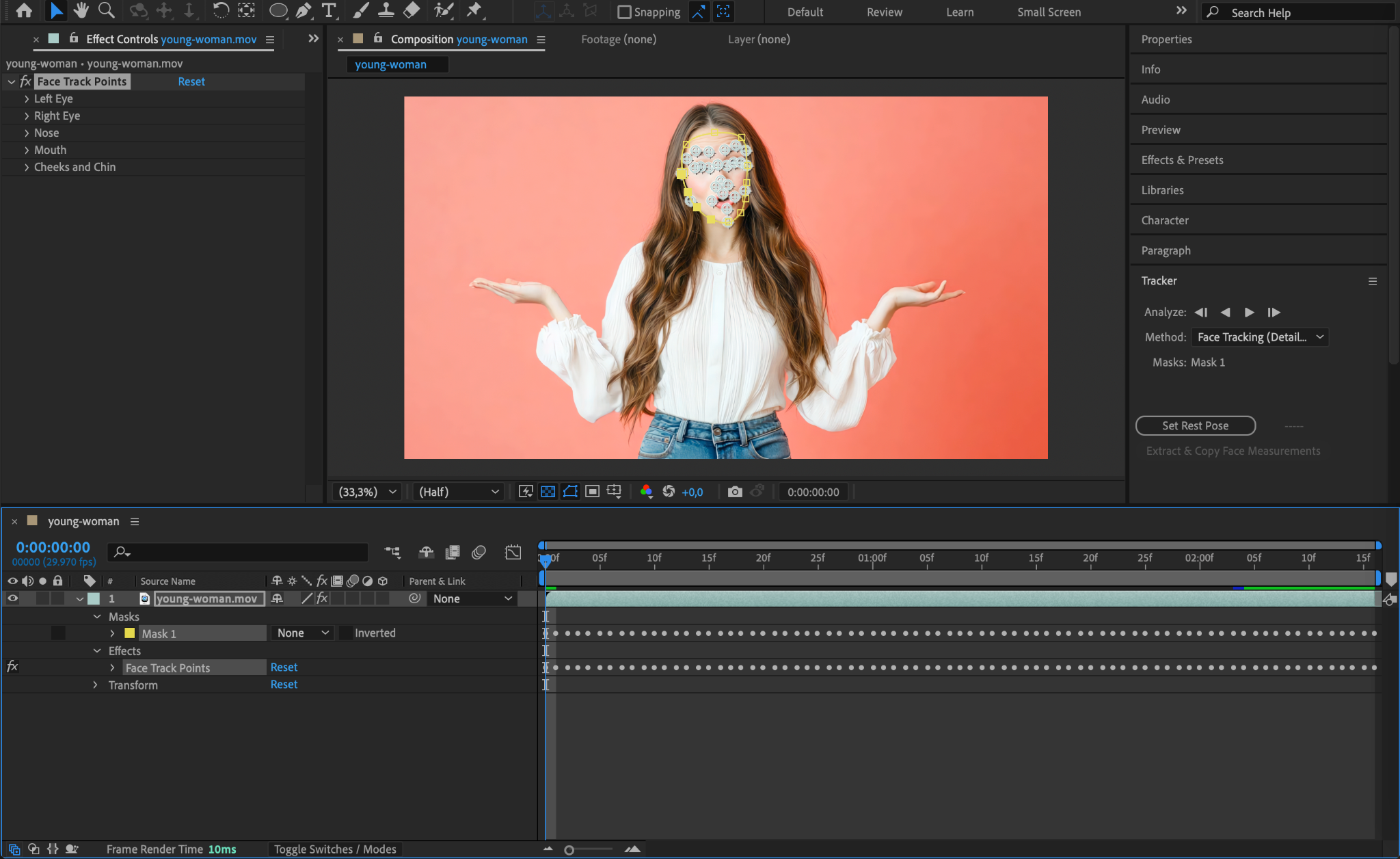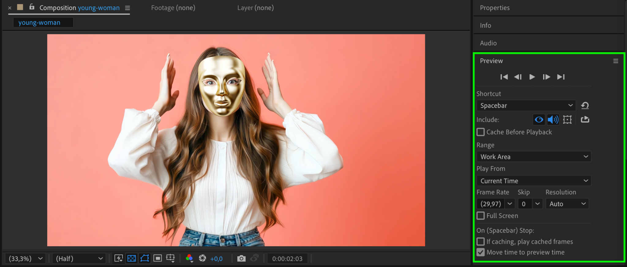 Press Spacebar to preview the animation. If needed, adjust the mask’s position, rotation, or scale to improve the alignment with the face.