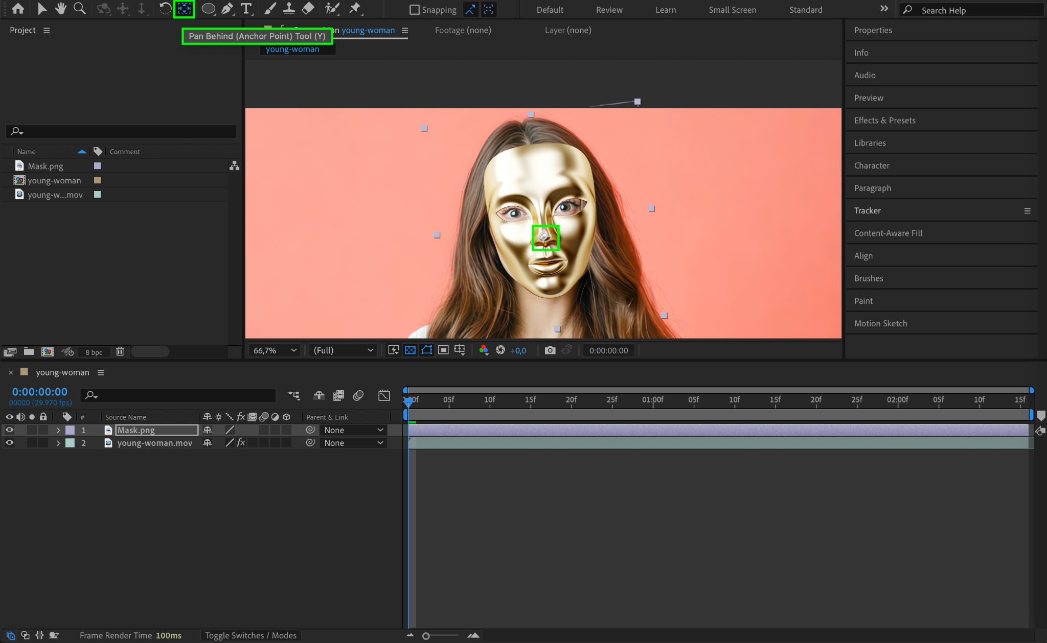 Select the image layer and use the Pan Behind Tool (Y) to move the Anchor Point to the center of the nose area of the mask. This helps the mask move naturally with facial motion.