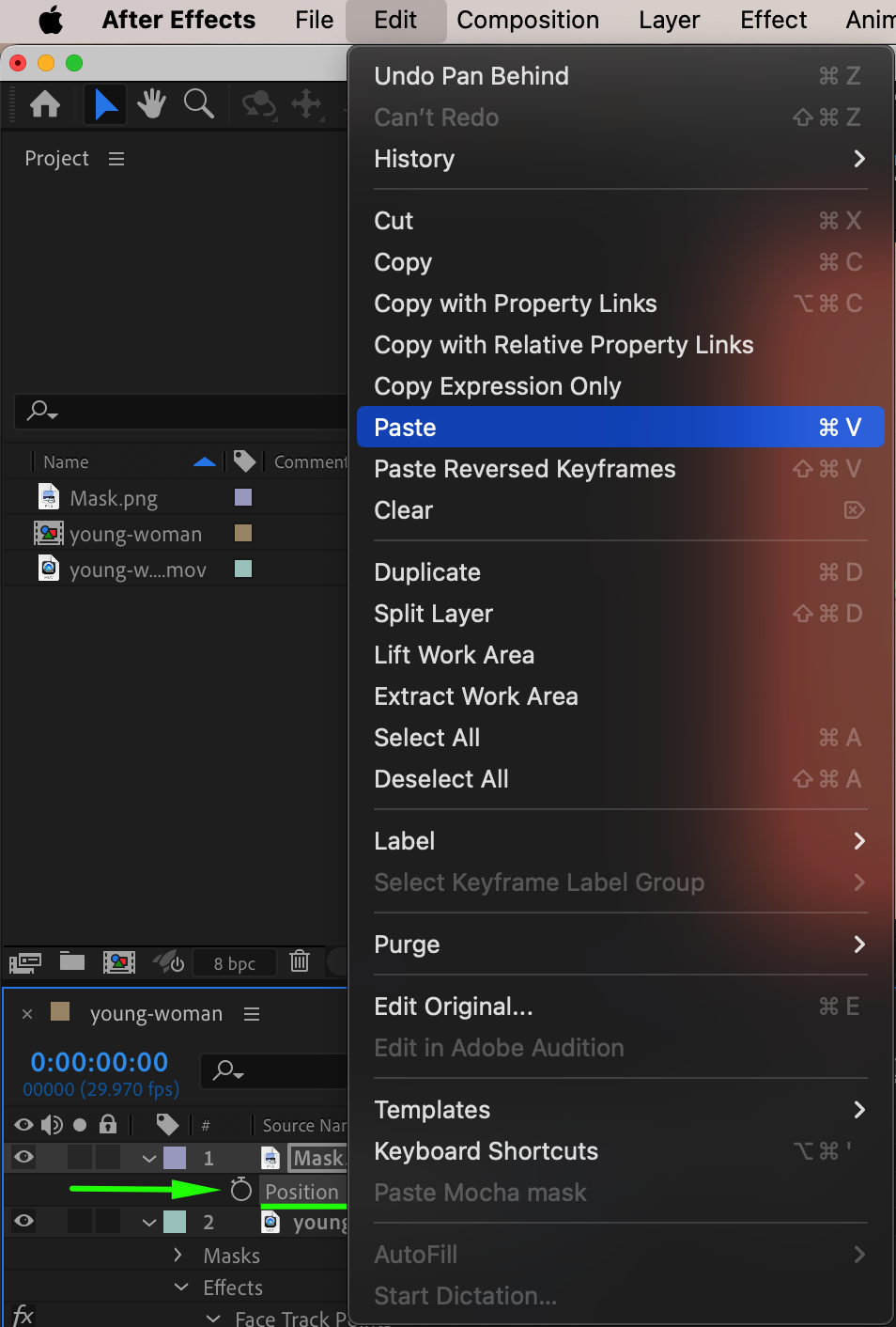 Expand the Video Layer in the Timeline and navigate to the Face Track Points section. Locate the Nose Tip keyframes. Select all keyframes by clicking on Nose Tip, then press “Ctrl/Cmd + C” to copy them. Next, select the face mask layer, go to its Position property, and press “Ctrl/Cmd + V” to paste the copied keyframes. This will ensure that the face mask follows the tracked motion accurately.
