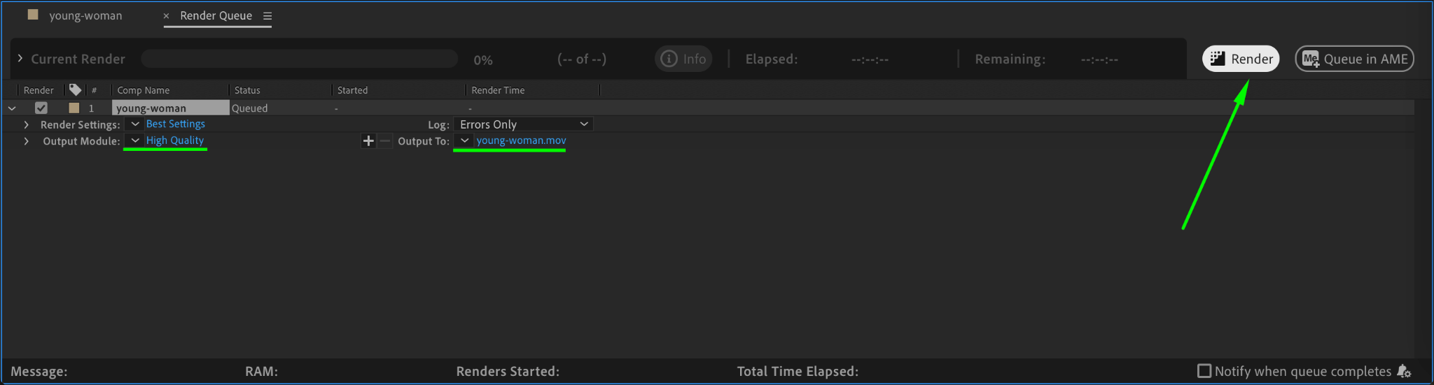Once satisfied with the result, go to Composition > Add to Render Queue, select the desired format, and click Render to export the final video.
