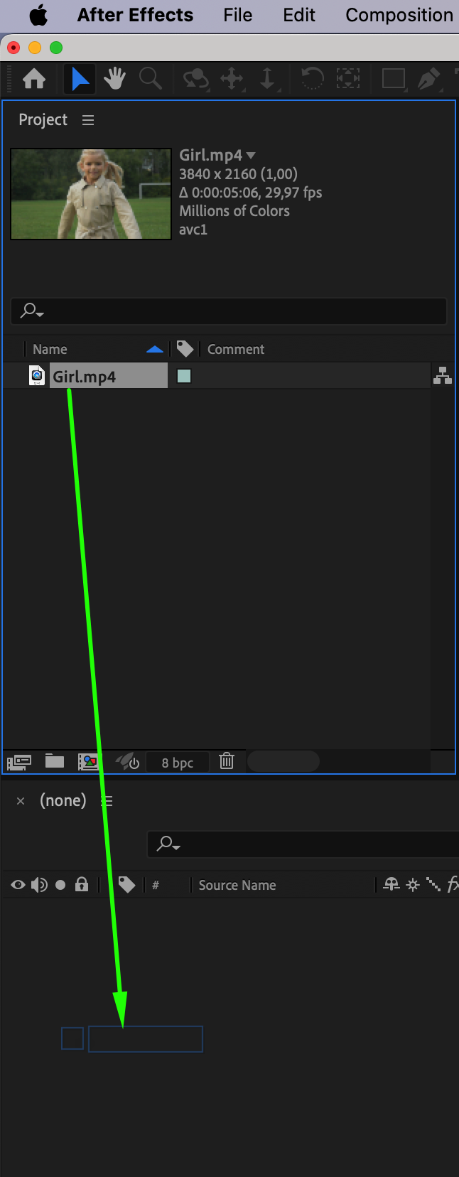 Go to File > Import > File, select your video, and drag it to the Timeline Panel to begin editing.