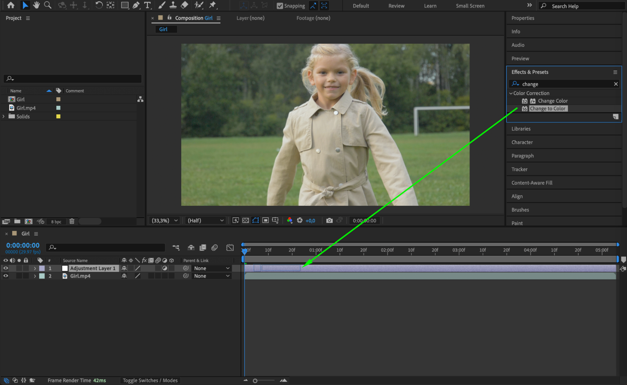 Open the Effects & Presets Panel, search for Change to Color, and drag it onto the adjustment layer. This effect allows you to modify a specific color in the video.