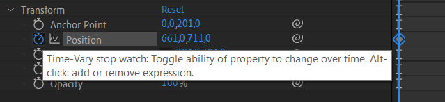 To retain the position of the keyframe at a specific moment, press the Time – Varу stopwatch button (toggle ability of property to change over time; Alt-click: add or remove expression).