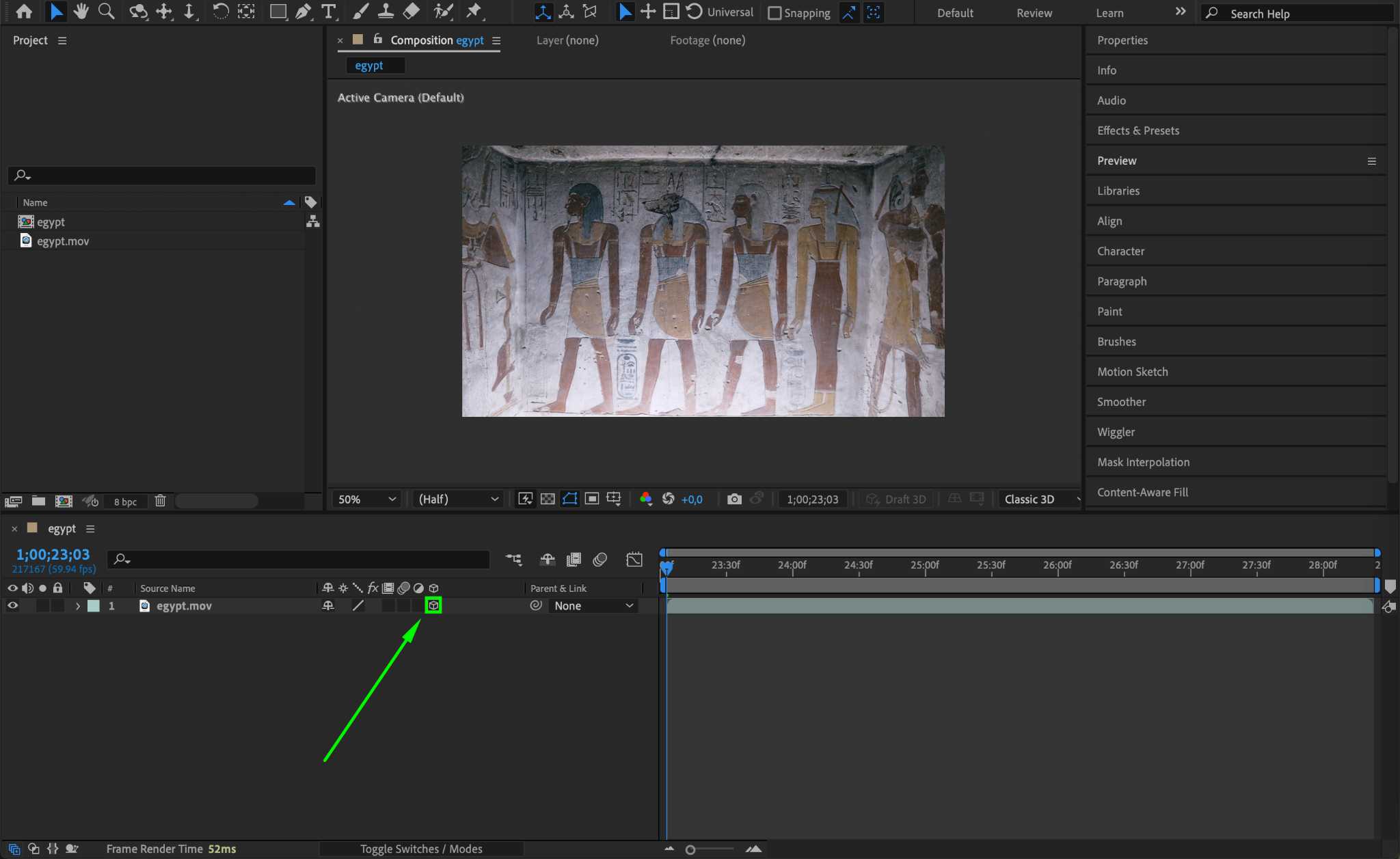 In the Timeline panel, find the video layer and enable the 3D Layer option by clicking the cube icon next to the layer name. Activating the 3D layer feature allows you to manipulate the video along the X, Y, and Z axes, giving you full control over the perspective. This step is essential for transforming the way your video looks in a 3D environment.
